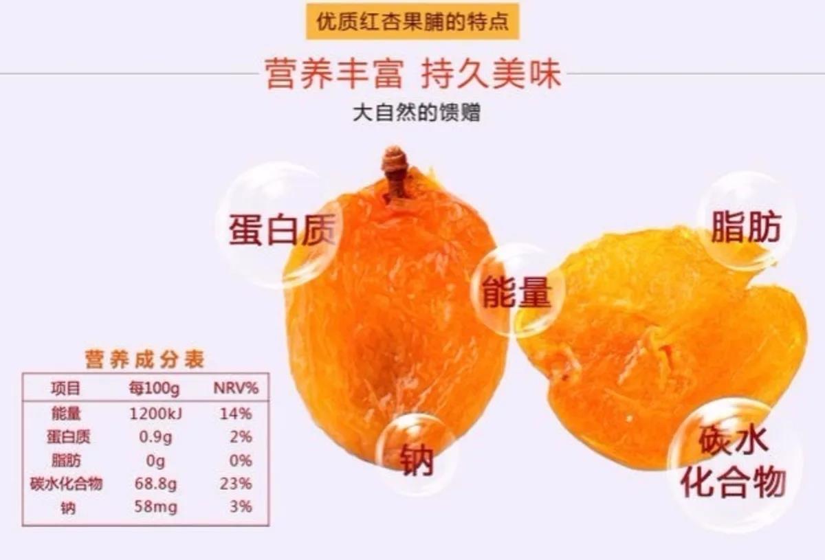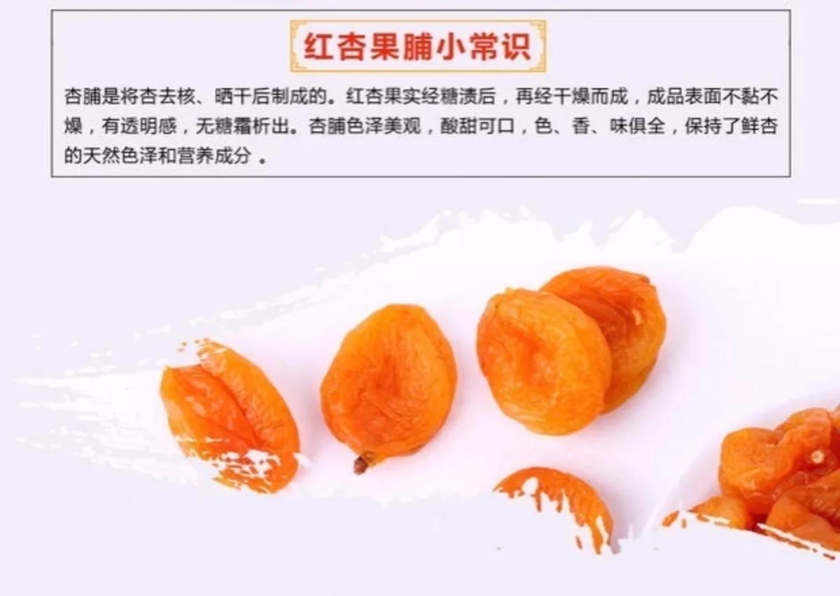 杏脯,保持了鲜杏的天然色泽和营养成分,色泽美观,酸甜可口,色、香、味俱全,并具有生津止渴,去冷热毒之功效。清代已有杏干生产。原料杏呈黄白或褐红色,肉质柔软,含可溶性固形物适中。