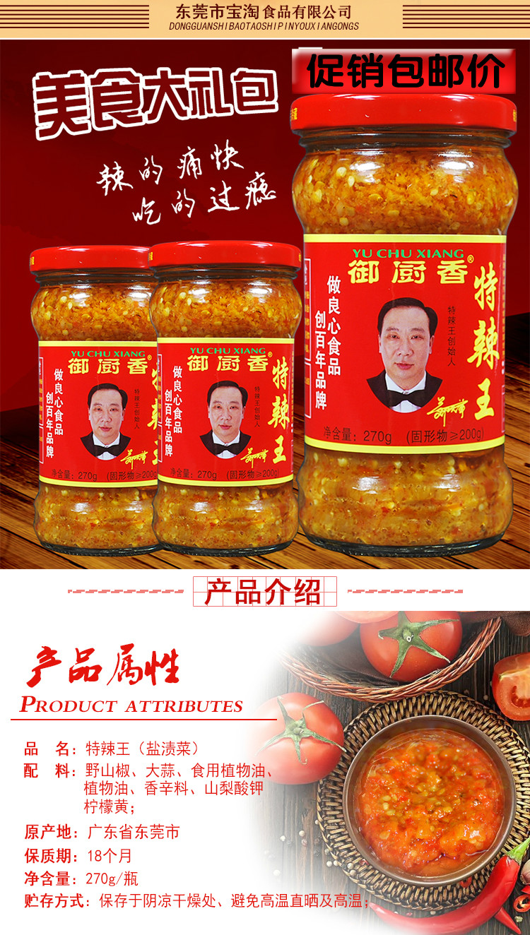 零食特产、酒水饮料 > 熟食 > 御厨香特辣王 270gX2瓶装 辣椒酱 下饭酱超巨辣 特辣王蒜蓉辣椒酱