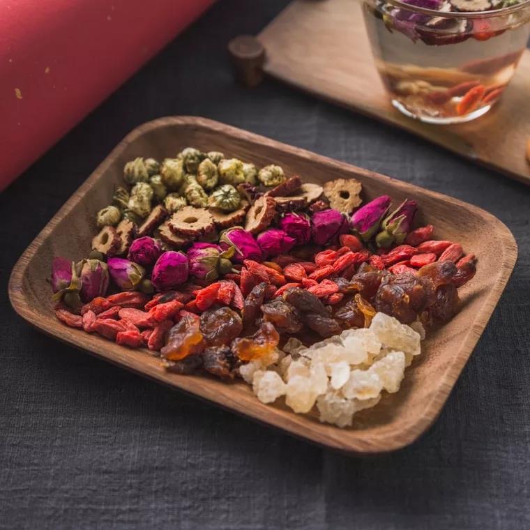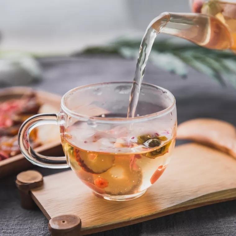桂圆红枣茶是一款四季都适合的茶饮,由桂圆、红枣、枸杞子、玫瑰、胎菊和老冰糖拼配而成,胎菊的中和不易上火。口感清甜,花香浓郁持久。