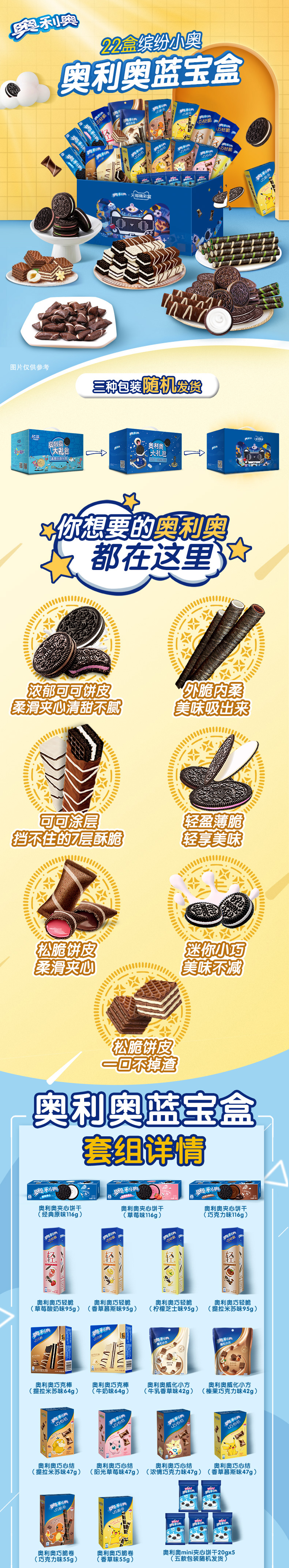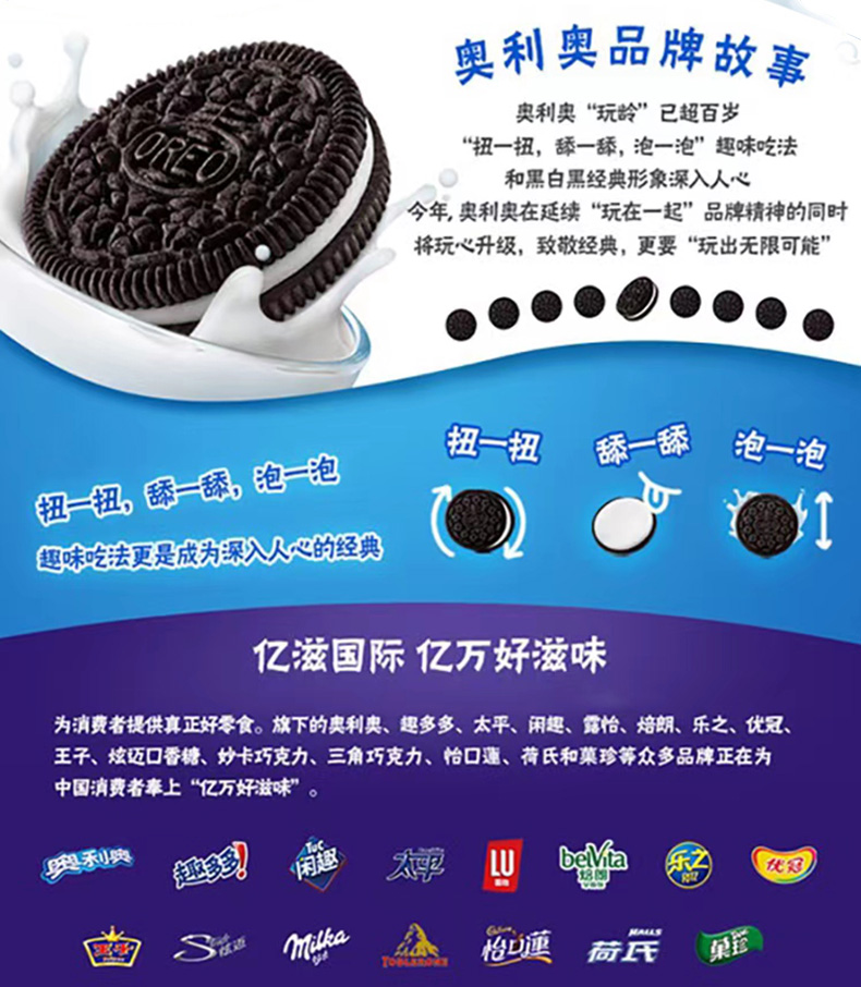 奥利奥夹心饼干(经典原味116g) 奥利奥夹心饼干(草莓味116g) 奥利奥夹心饼干(巧克力味116g) 奥利奥轻巧脆(草莓酸奶味95g) 奥利奥轻巧脆(香草慕斯95g) 奥利奥轻巧脆(柠檬芝士味95g) 奥利奥轻巧脆(提拉米苏味95g) 奥利奥巧克力棒(提拉米苏味64g) 奥利奥巧克力棒(牛奶味64g)奥利奥威化小方(牛乳香草味42g)奥利奥威化小方(榛果巧克力味42g)奥利奥巧心结(提拉米苏味47g)奥利奥巧心结(阳光草莓味47g)奥利奥巧心结(浓情巧克力味47g)奥利奥巧心结(香草慕斯味47g)奥利奥巧脆卷(巧克力味55g)奥利奥巧脆卷(香草味55g)