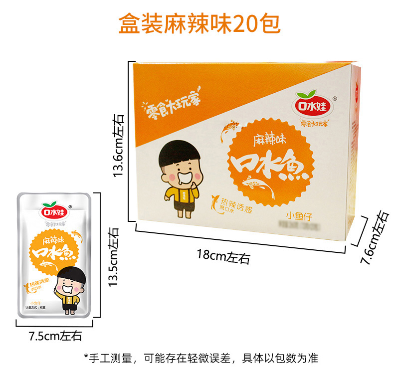 散称小鱼每包克重约为9克.口味分别为:香辣味、麻辣味、酱香味、糖醋味、泡椒味(酸辣),5种口味随机混发'不低于4种口味!可联系客服指定口味及指定比例混合,具体请以收到的口味和克重为准。