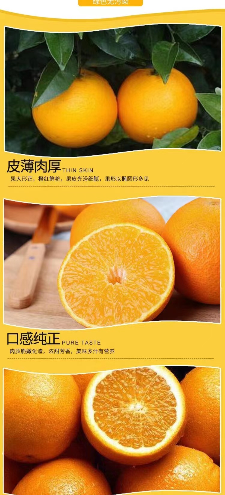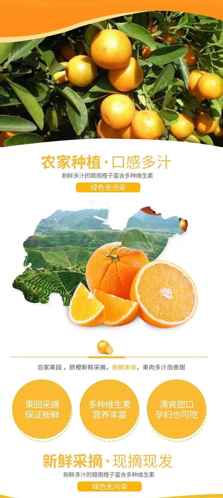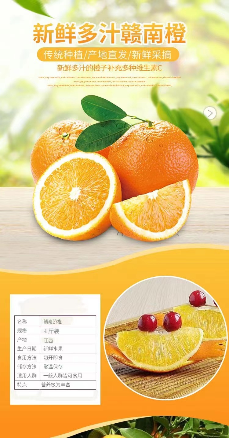 赣南脐橙肉质脆嫩、化渣,风味浓甜芳香,有较浓郁的橙香味;口感甜酸适度。