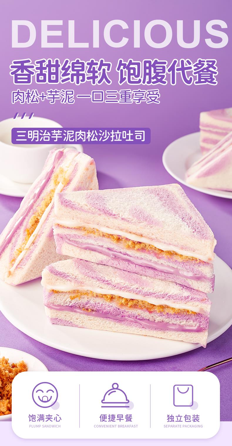 彩虹芋泥肉松三明治是一款美味的三明治,它的松软可口,甜度适中,味道新鲜,芋泥浓香,美味解馋。这款三明治采用了新鲜的彩虹芋泥,搭配上美味的肉松,让您的味蕾享受不同的口感。它的彩虹芋泥口感细腻,肉松的鲜香味道让您回味无穷。无论是作为早餐、午餐还是晚餐,这款彩虹芋泥肉松三明治都是一个美味的选择,让您的生活更加丰富多彩。