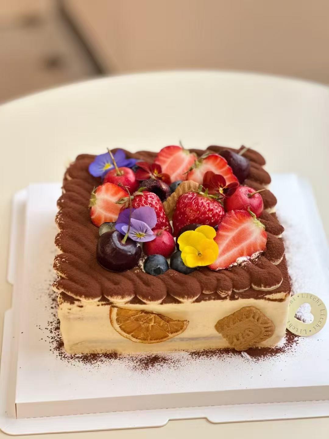 这款提拉米苏蛋糕,将经典意式风味与精致装饰完美融合。蛋糕体层次丰富,细腻的马斯卡彭芝士与浓郁的咖啡香相互交织,带来丝滑而醇厚的口感。表面点缀着新鲜的草莓、蓝莓、车厘子等水果,色彩斑斓,不仅增添了视觉上的美感,更为蛋糕带来了清新的果香。精致的巧克力装饰和可食用花朵,提升了整体的格调。无论是作为下午茶的甜点,还是庆祝特殊时刻的美味选择,这款提拉米苏蛋糕都能为您带来无与伦比的味觉享受。