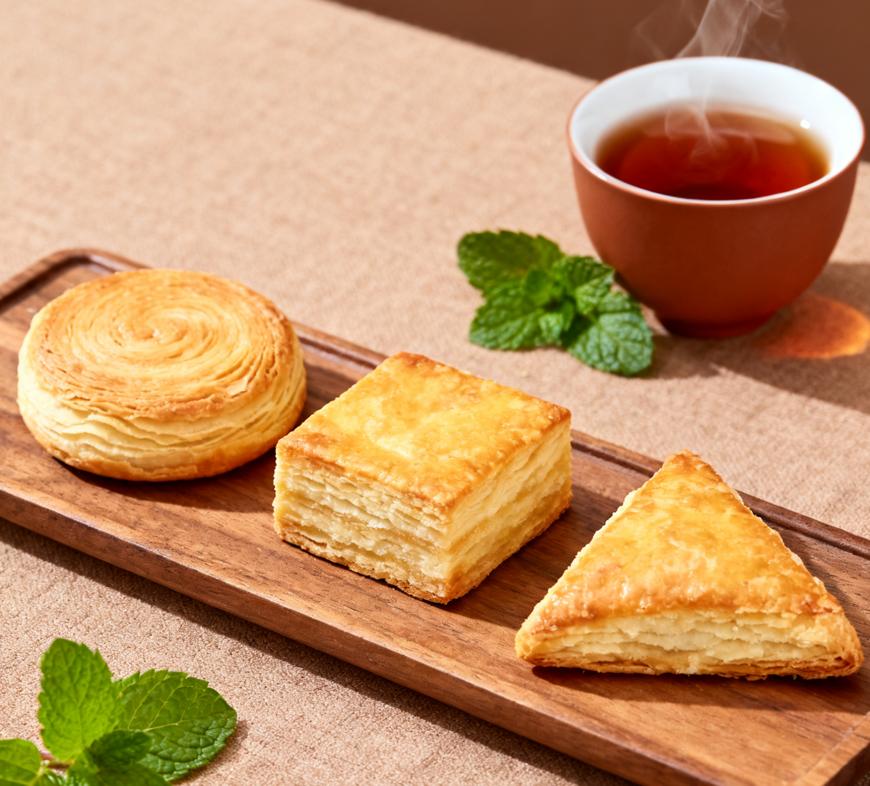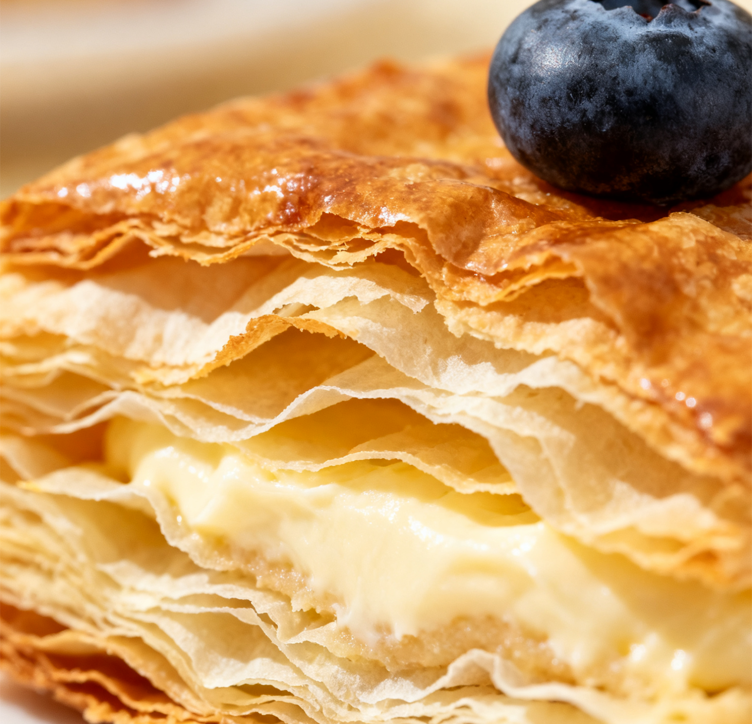 千酥层也叫拿破仑蛋糕,名字意为 “千片叶子”,贴合其多层酥皮的特点。由多层金黄酥脆的酥皮夹着香甜的糕点奶油制成,顶层常撒糖粉或做上釉处理,口感松脆与绵密兼具,是法式糕点中极具层次感的经典款。