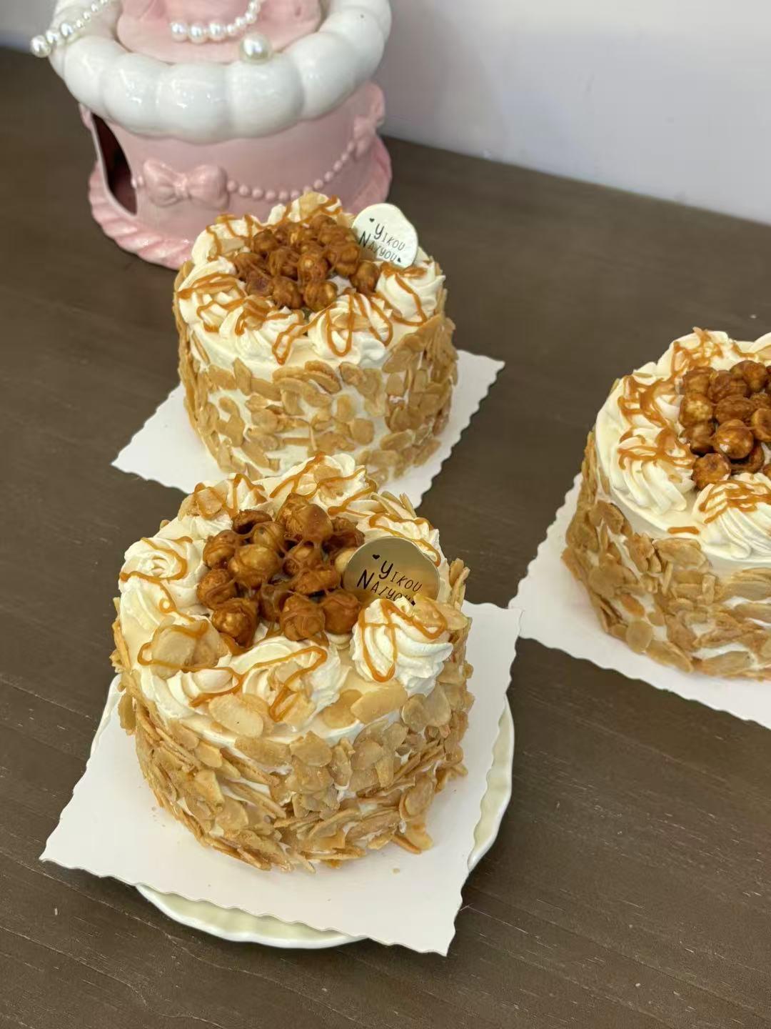 暖调焦糖色的治愈甜口——外层裹满烤香的杏仁片,脆感裹着奶油的柔润;顶部是焦香酥脆的焦糖脆珠,咬开是坚果的香与焦糖的甜;夹心是轻盈的焦糖奶油,配松软蛋糕胚,每一口都是“脆+柔+香”的三重层次,是秋冬里的暖甜小确幸~
