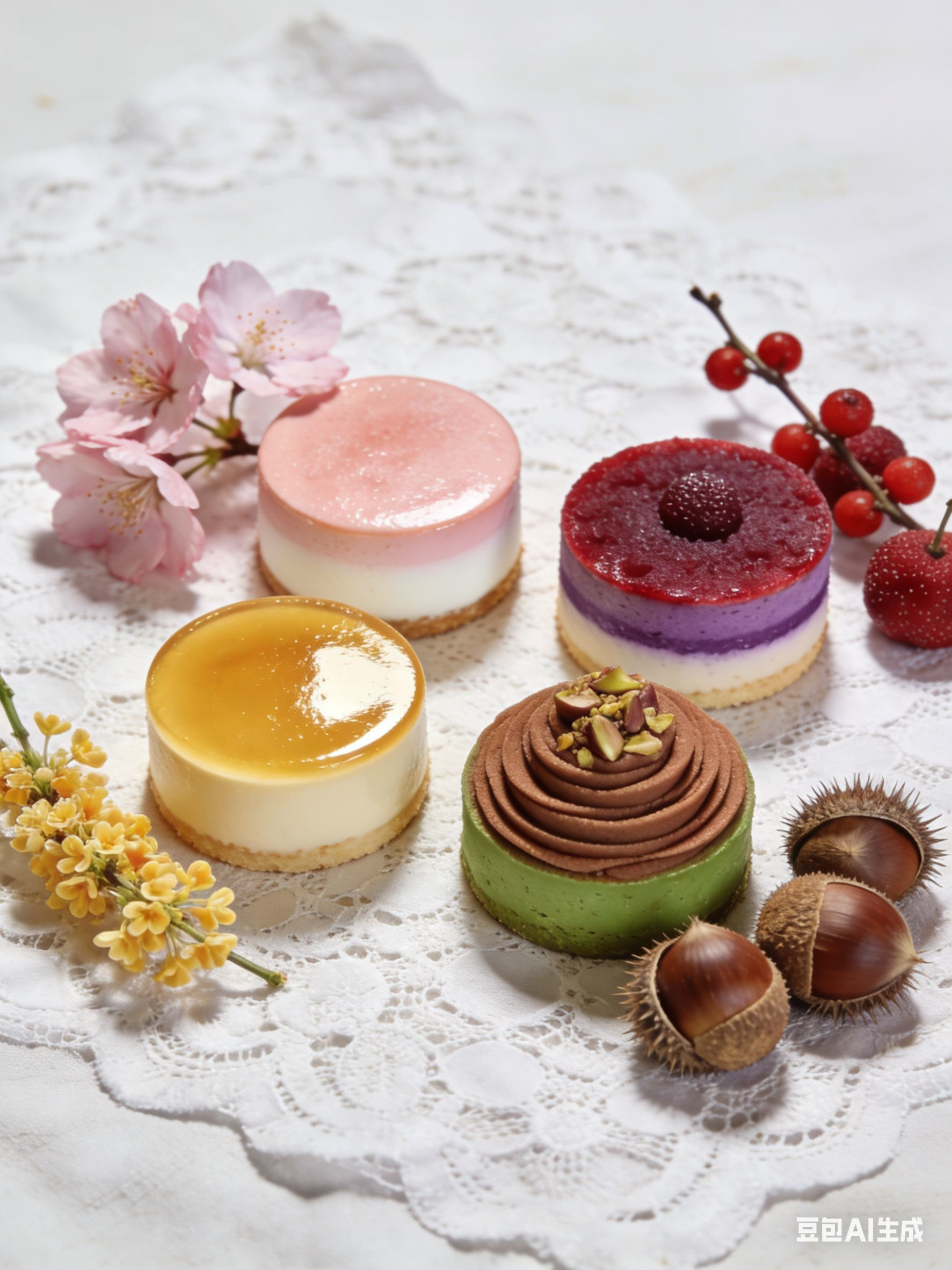 春分樱花慕斯、夏至杨梅芝士、秋分桂花奶冻、冬至栗子蒙布朗,每款含当季鲜果酱夹层,低糖配方(糖分减少30%)