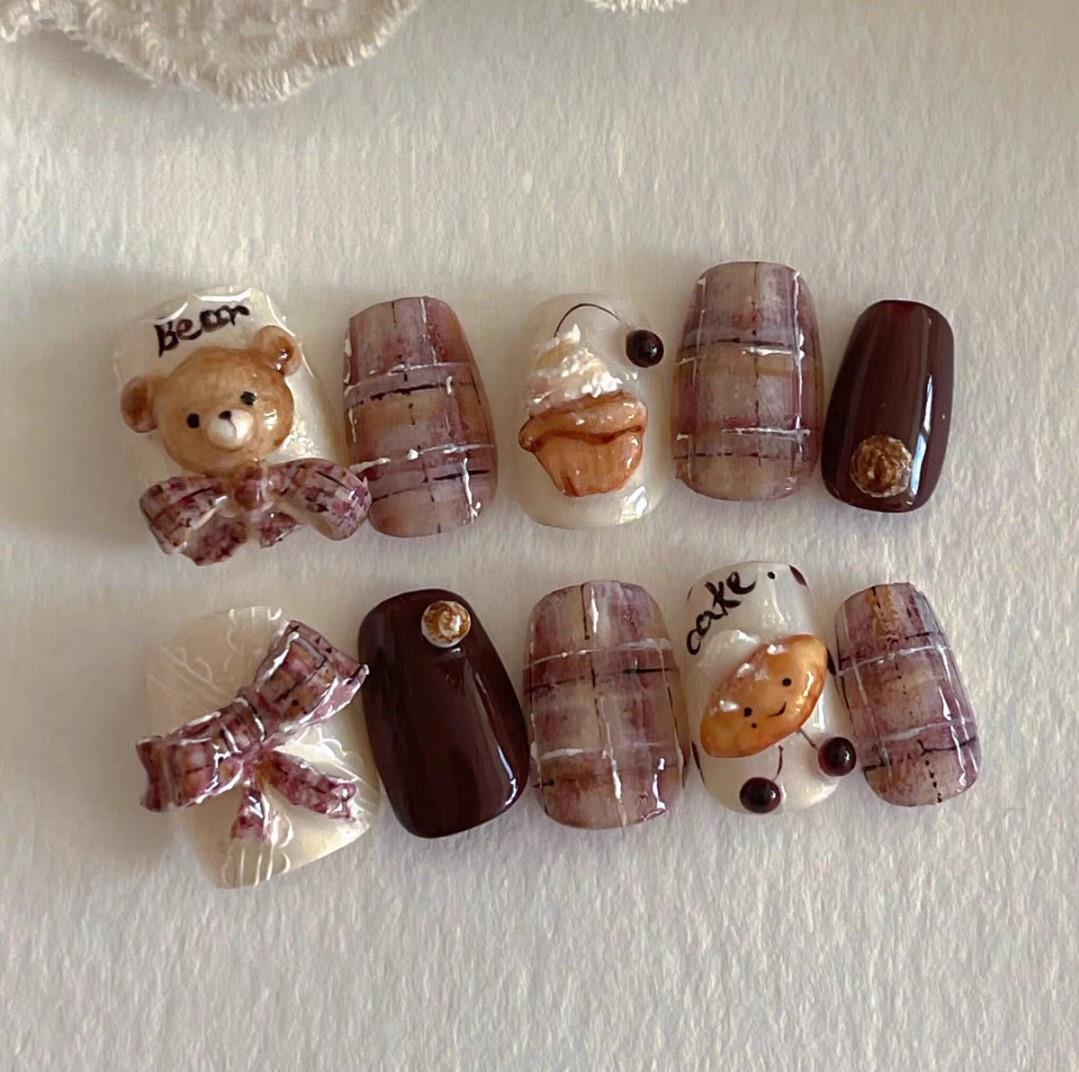 可爱风秋冬美拉德小熊手工穿戴甲定制美甲