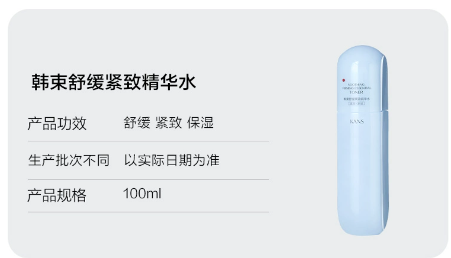 品牌:Kans/韩束化妆水/爽肤水单品:韩束舒缓紧致精华水产地:中国