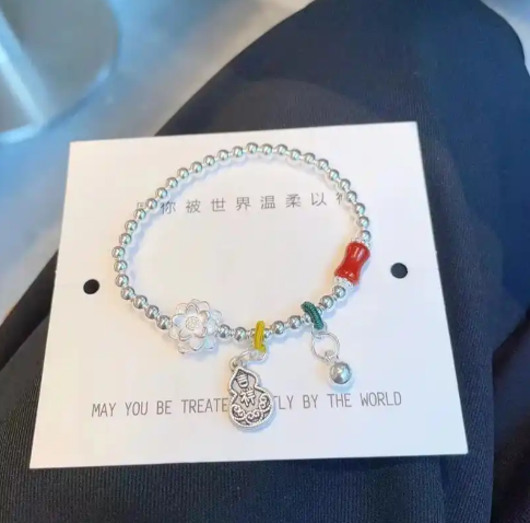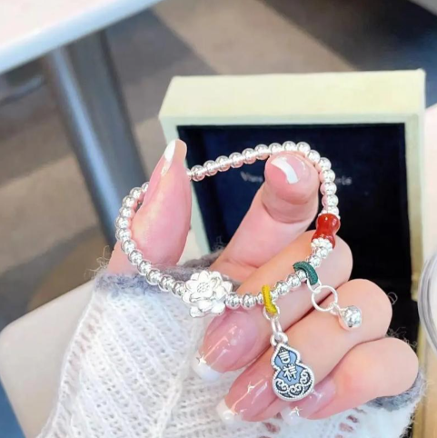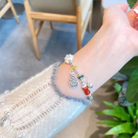 设计上,融入莲韵与福禄元素。莲花在中国文化里象征纯洁、美好 ,葫芦谐音“福禄”,寓意幸福、财富,有着吉祥富贵、福寿绵长的美意。手链可能采用手工编织等工艺,将银饰与绳艺巧妙结合,风格或为新中式,兼具古典韵味与现代时尚感 。