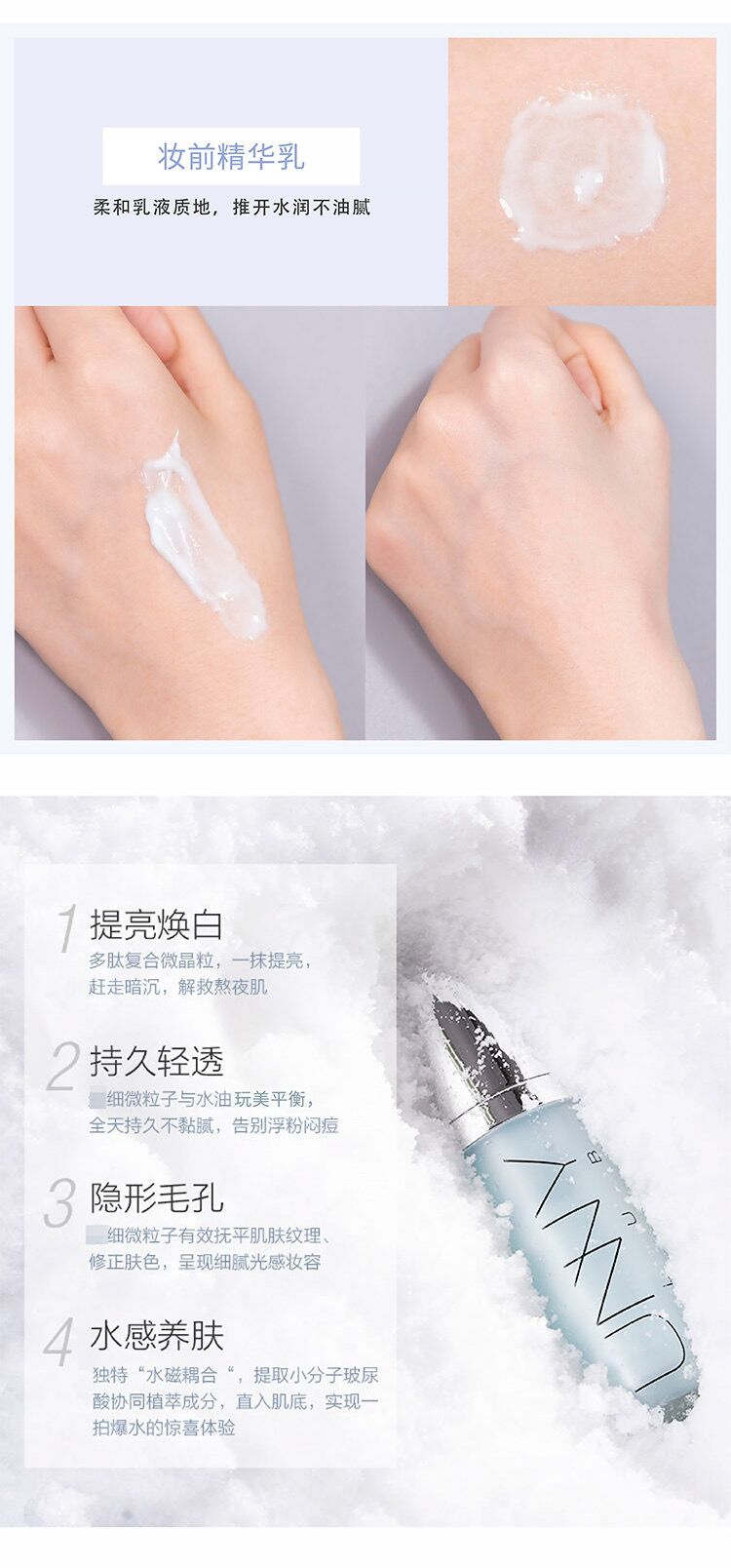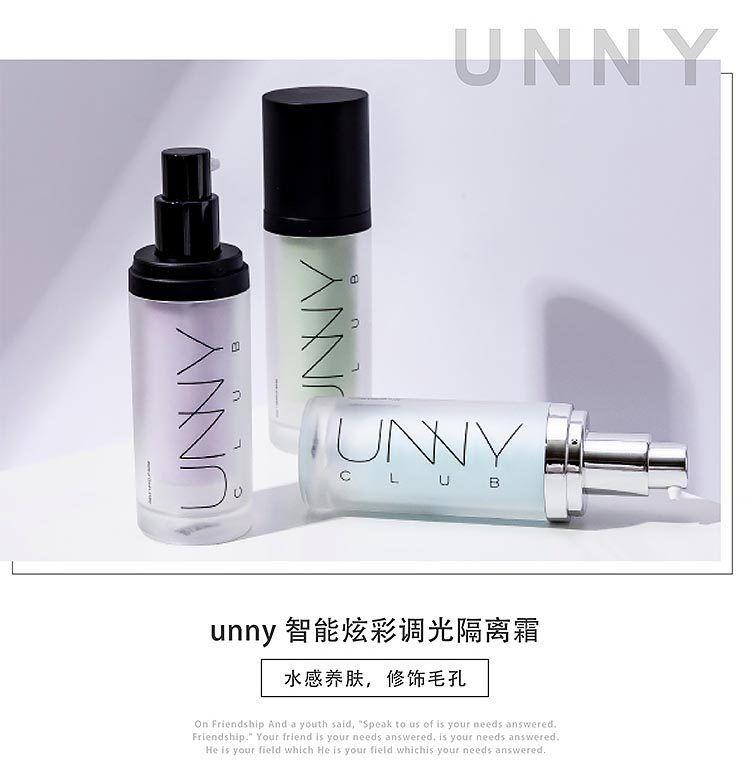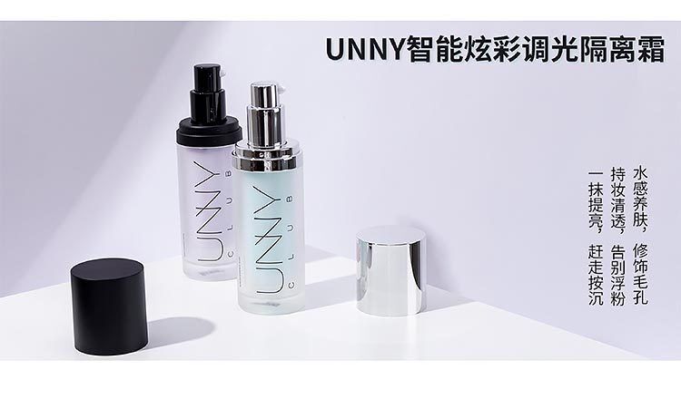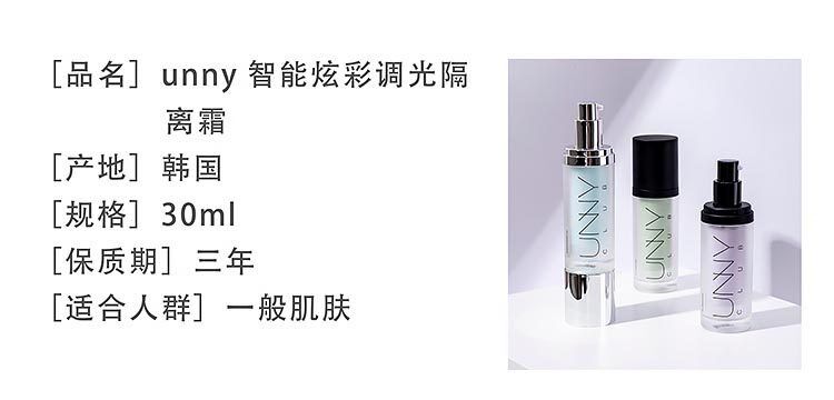 UNNY智能炫彩调光隔离霜,它是集精华面霜和隔离妆前乳多效合一的素颜精华液,上妆快、没粉感,水润亮泽、修饰毛孔、自然服帖,且含积雪草、深海珊瑚藻和玻尿酸三大核心成分黄金配比,以满足不同肌肤需求。