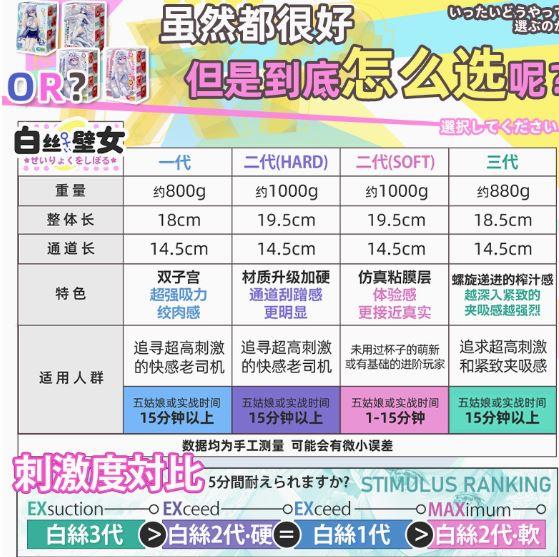 我买的gxp家的第三款产品了,是我目前拥有的妃子里最宠爱的一个。第一个杯子就是之前买的白丝二代软款,没什么感觉,这次为了体验刺激,直接下单了据说是白丝各代最刺激的款式,果不其然,真真是刺激。880g的重量正正好,不轻又不重,既有包裹感,又能单手把玩。还有值得说道的通道设计,即使我**不是很敏感,不能像写小黄文般写出细致的使用体验和感想,但这代给我的感觉属实是比二代软款要强,就是那种剐蹭感和吸力,真的让我感觉要上天,到货当天,来了一发又一发,简直是要上瘾啊。即使后面有了据说是最强吸力的对子哈特炼金术士和最刺激的exe六连脉二代,由于重量上的劣势,感觉也还是不如白丝三代。有点遗憾的是刚出来那会儿因为刚买了白丝二代,再加上想等多点时日等等网上的测评再来决定下单,结果等了十多天,也没看到网上有什么白丝三代的测评,再加上最近想玩玩刺激款,才下单的白丝三代。结果下单时告诉我赠品已经没了,有点失望,其实我蛮喜欢那个蕾丝裙的,单卖也行啊,早知道就早点儿买了