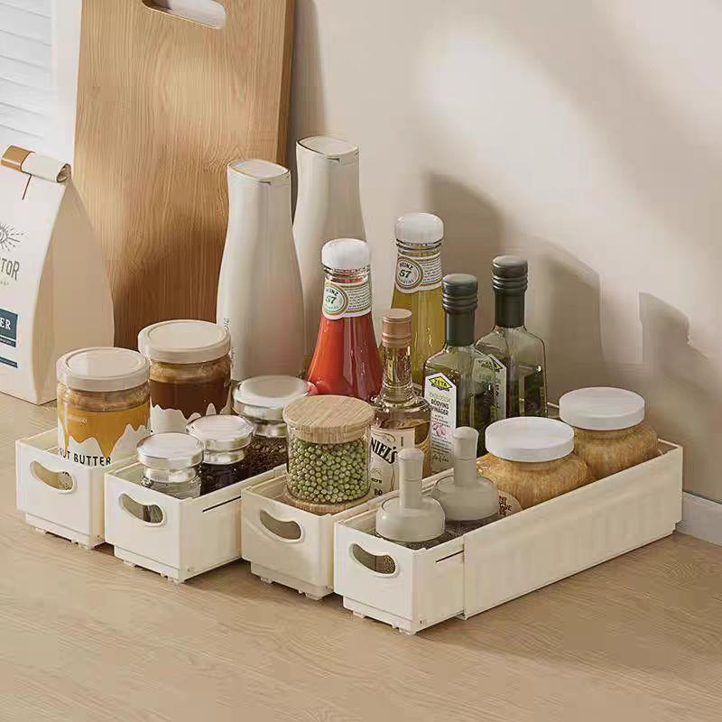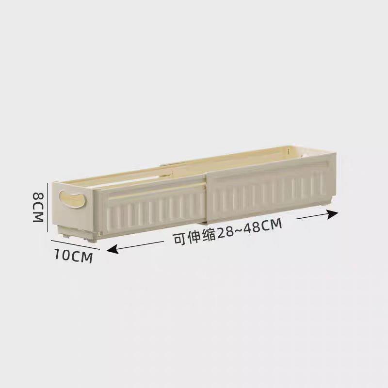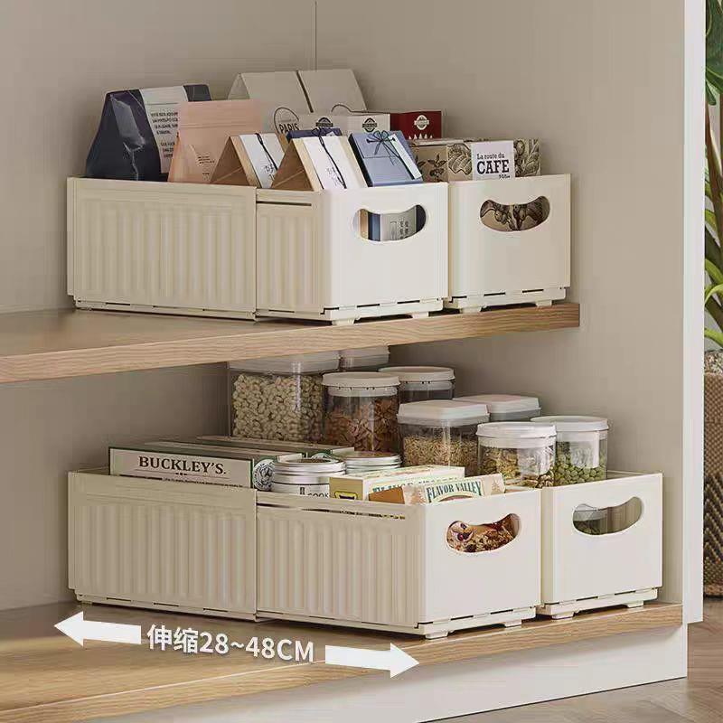 自由伸缩,扩容空间,叠加使用;可伸缩28-48cm,适应不同橱柜宽度;底部四脚加高,便于叠加收纳;圆润把手,无毛刺不伤手。