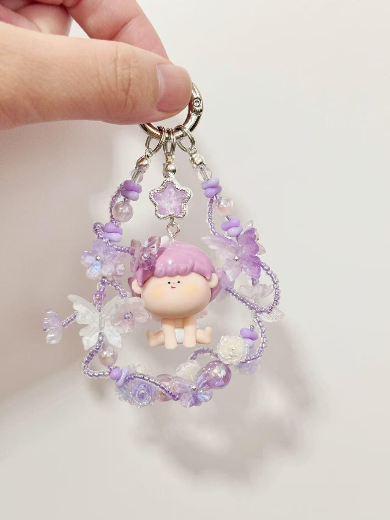 这是一款淡紫色调的可爱挂坠。主体是一个有着淡紫色头发的莉莉丝,模样乖巧。挂坠上方有一个紫色的星星形装饰,周围环绕着紫色珠子、透明蝴蝶形状的珠子以及其他带有珠光效果的装饰 ,整体造型梦幻又精致,挂在包包或钥匙上,能瞬间提升时尚感与可爱度。