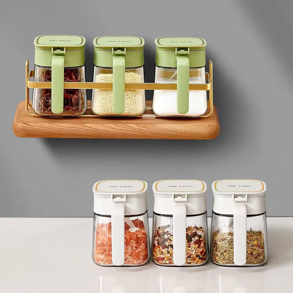 - 旋转调味架款:多个玻璃调味罐组合在旋转调味架上,节省空间,方便取用不同调料,使厨房整洁有序。