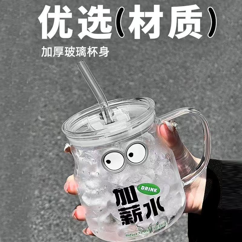外观:透明杯身,带有把手,杯上装饰有搞怪大眼睛图案,搭配同款杯盖和吸管,整体可爱又吸睛 。
