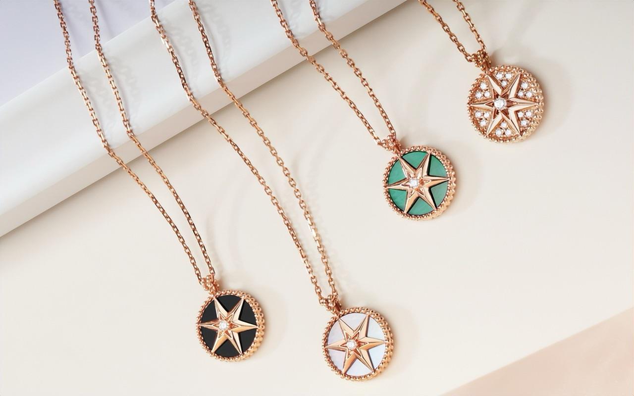 金色的链条搭配星星形状的吊坠,吊坠上有绿色的装饰,整体设计简约时尚,充满活力。