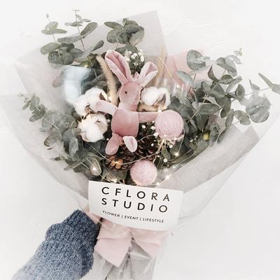 花束用材:白色木棉、尤加利叶(ps:尤加利叶具有干花属性,会变成干叶,颜色稍退,不喜勿拍)、永生兔尾、松果、满天星、毛线球、串灯