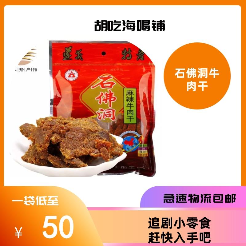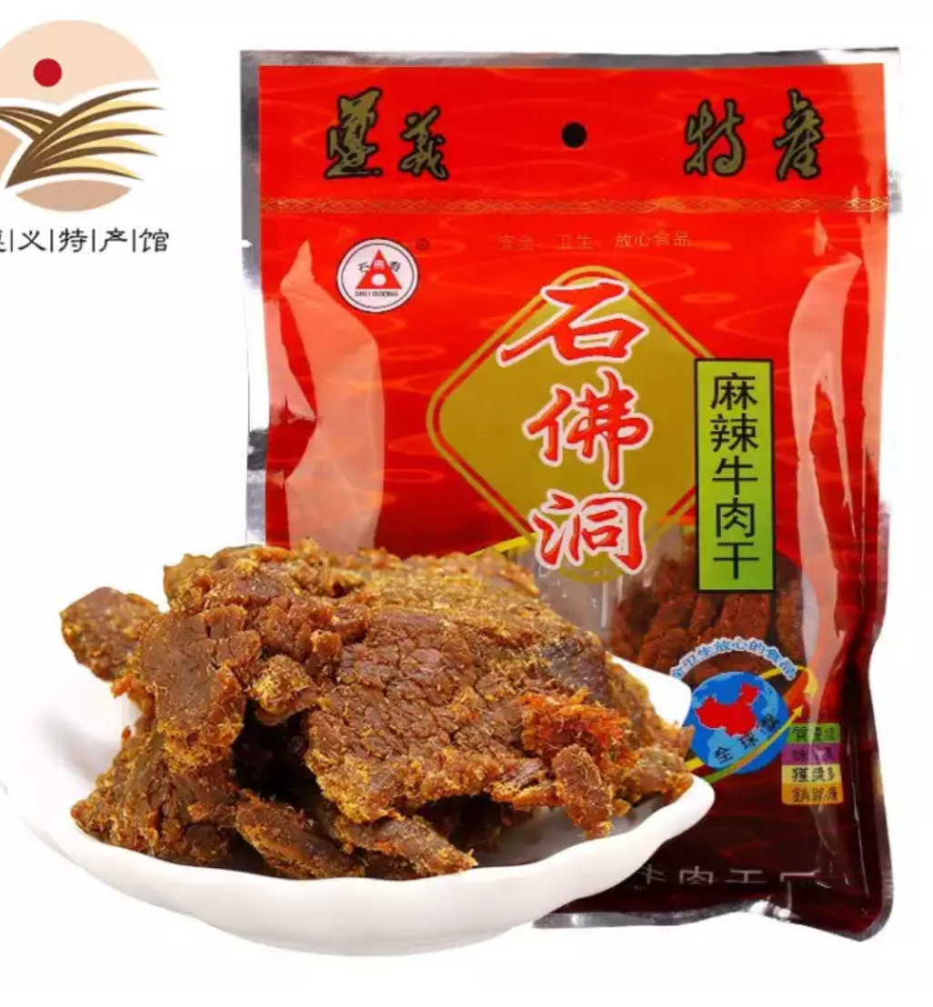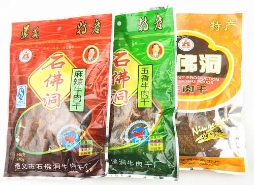 遵义市石佛洞牌牛肉干系列产品,是以贵州高原盛产的鲜牛肉为主料,加上白糖、蜂蜜、精盐、料酒、味精、花椒、辣椒、自配香料等精工细作而成,口味有麻辣(川味)、五香(广味)沙嗲和其他多种口味,形状有片、条、方颗粒(糖果式)丝等。 其味道香浓可口,很有劲道。