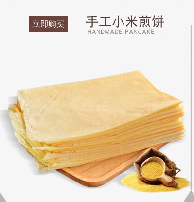 清代蒲松龄《煎饼赋》:“溲含米豆,磨如胶饧,扒须两歧之势,鏊为鼎足之形,掬瓦盆之一勺,经火烙而滂,乃急手而左旋,如磨上之蚁行,黄白忽变,斯须而成,‘卒律葛答’,乘此热铛,一翻手而覆手,作十百于俄顷,圆于望月,大如铜铮,薄似剡溪之纸,色如黄鹤之翎,此煎饼之定制也。