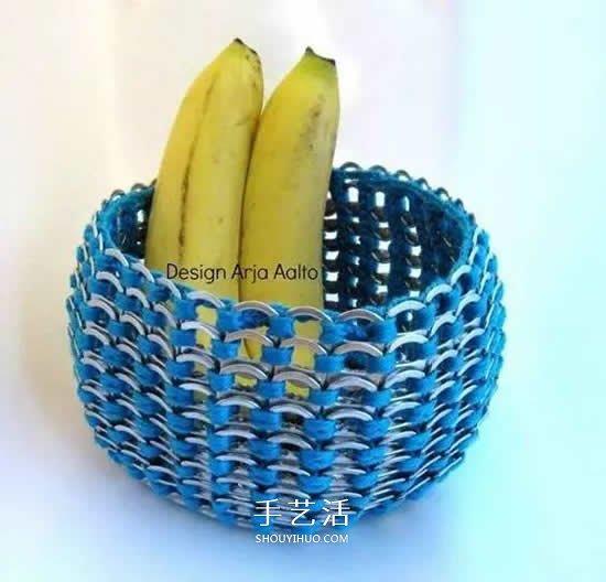 用蓝色毛线和拉环编织出收纳篮,可爱的模样就像是只变异菠萝,不放东西也是好看的装饰品。