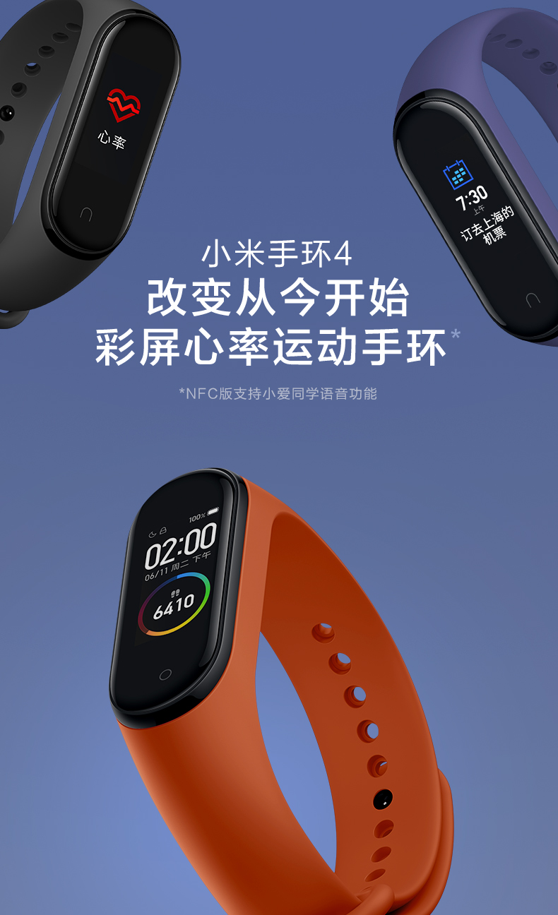 小米手环4智能手表心率监测蓝牙男女款运动计步器微信支付宝天气心率睡眠手环5