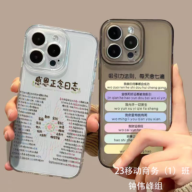 - 设计特点:将“正念感恩”“吸引力法则”等心理成长内容融入手机壳,兼具装饰性与情绪/自我管理的功能价值。