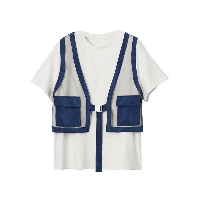 外层的马甲拼接纯棉网纱面料,轻盈透气 ,一件衣服穿出叠穿效果,适合夏天穿着搭配。
