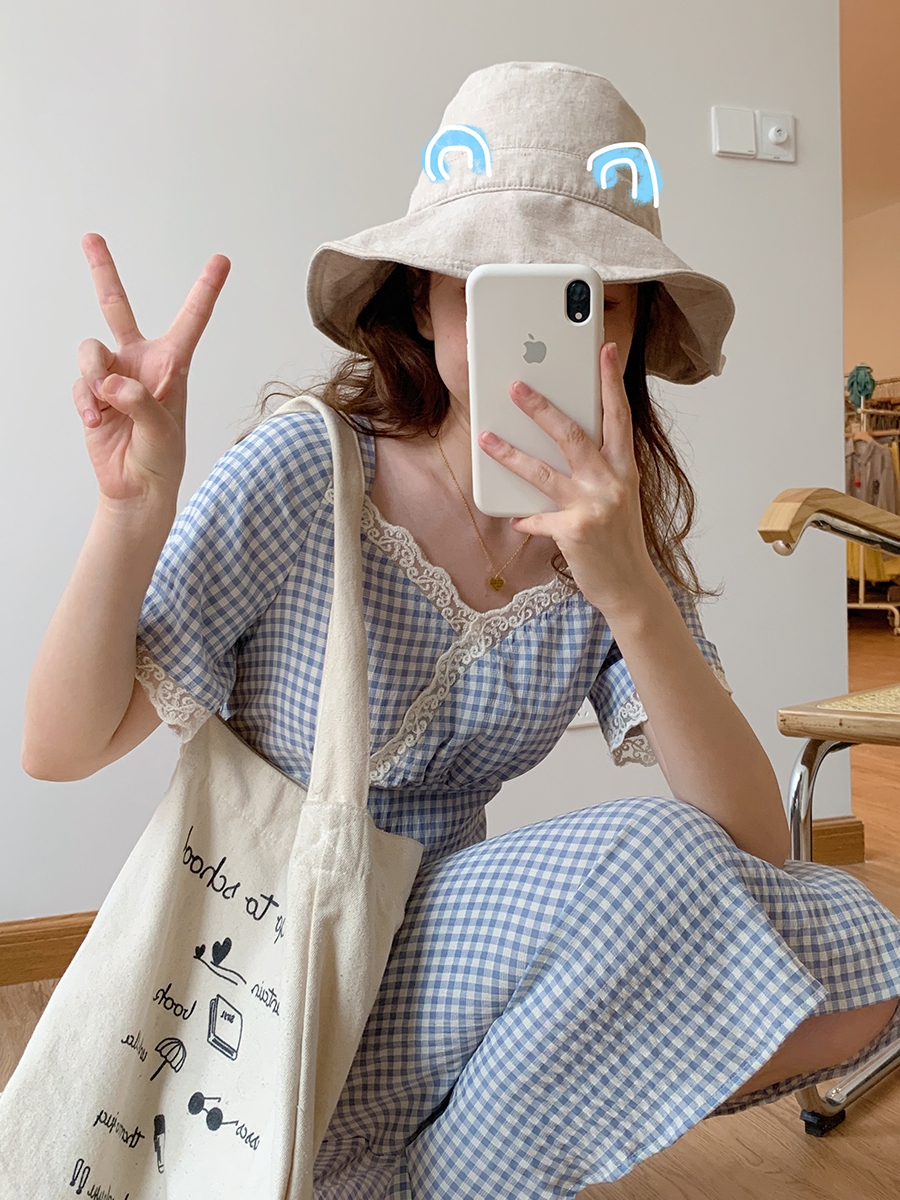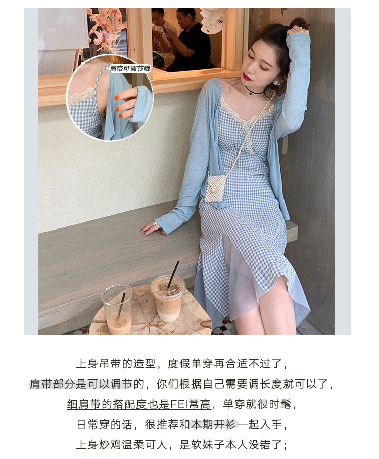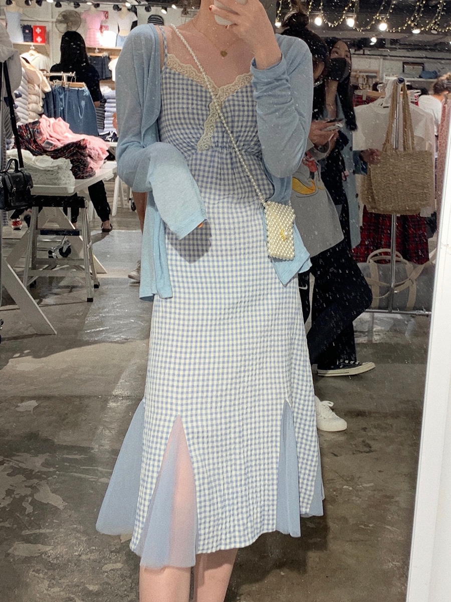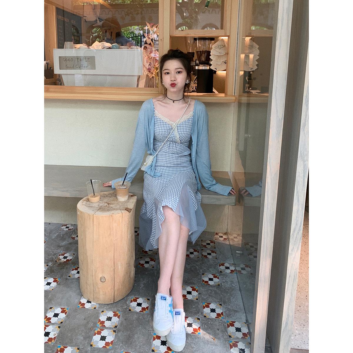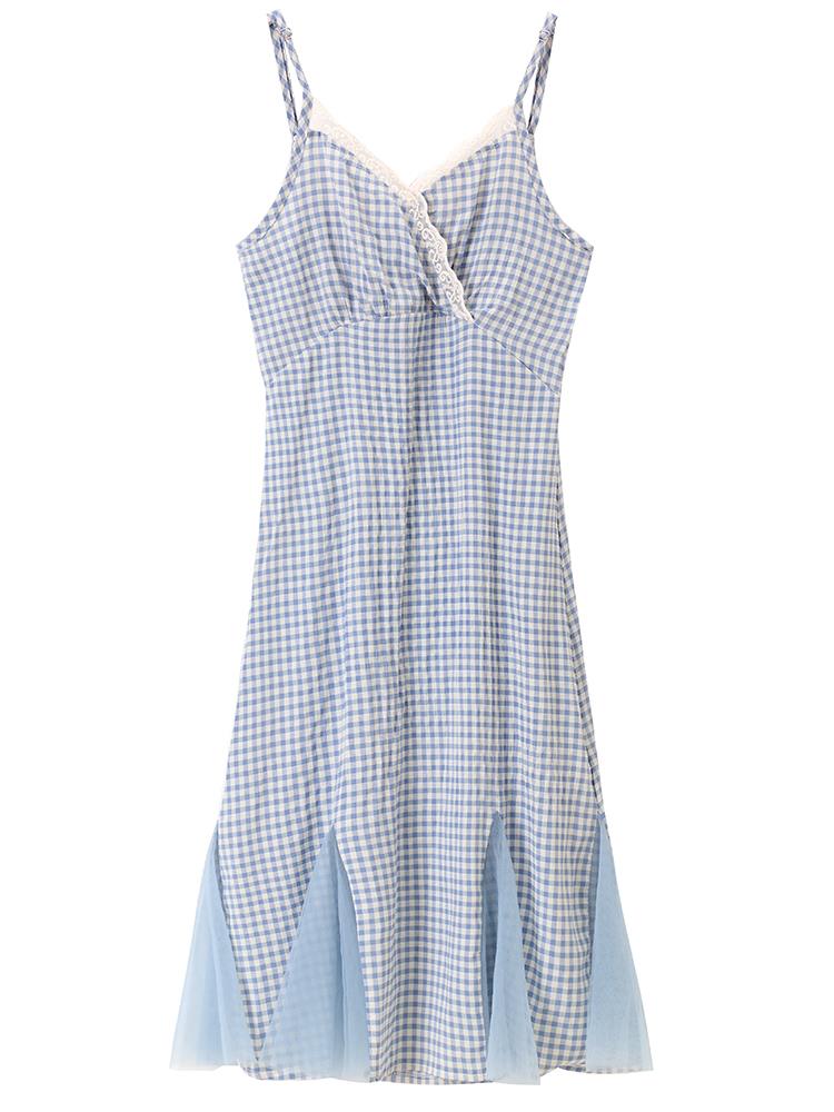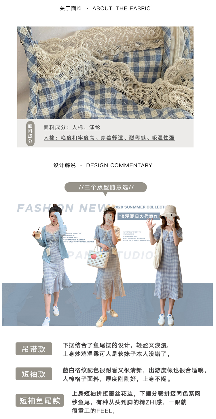 服饰箱包、运动户外 > 上装 > 兔兔酱 蓝色格子鱼尾裙女夏气质蕾丝网纱拼接连衣裙温柔风长裙