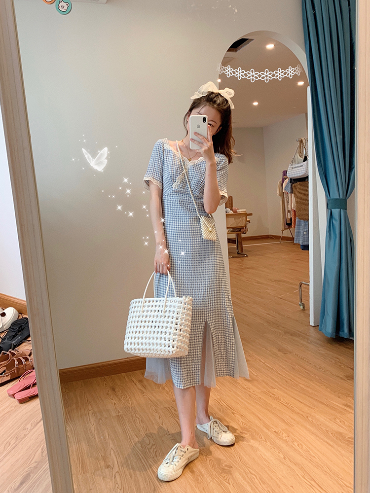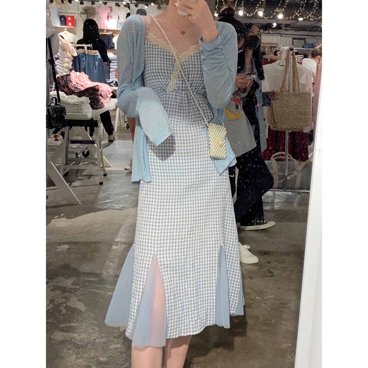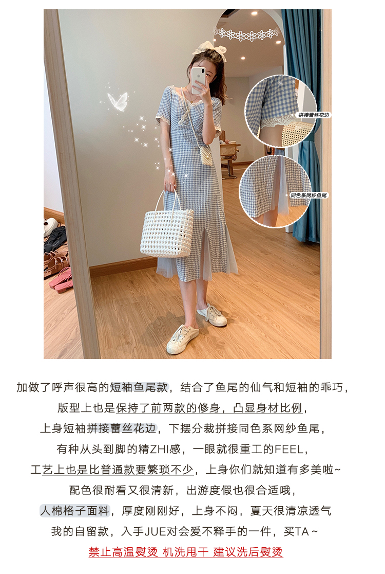 兔兔酱 蓝色格子鱼尾裙女夏气质蕾丝网纱拼接连衣裙温柔风长裙