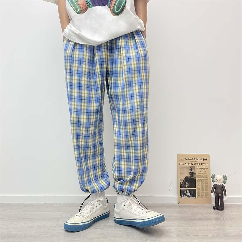 二更宽松格子休闲裤女情侣薄款直筒束脚裤长裤男大码夏季九分裤子
