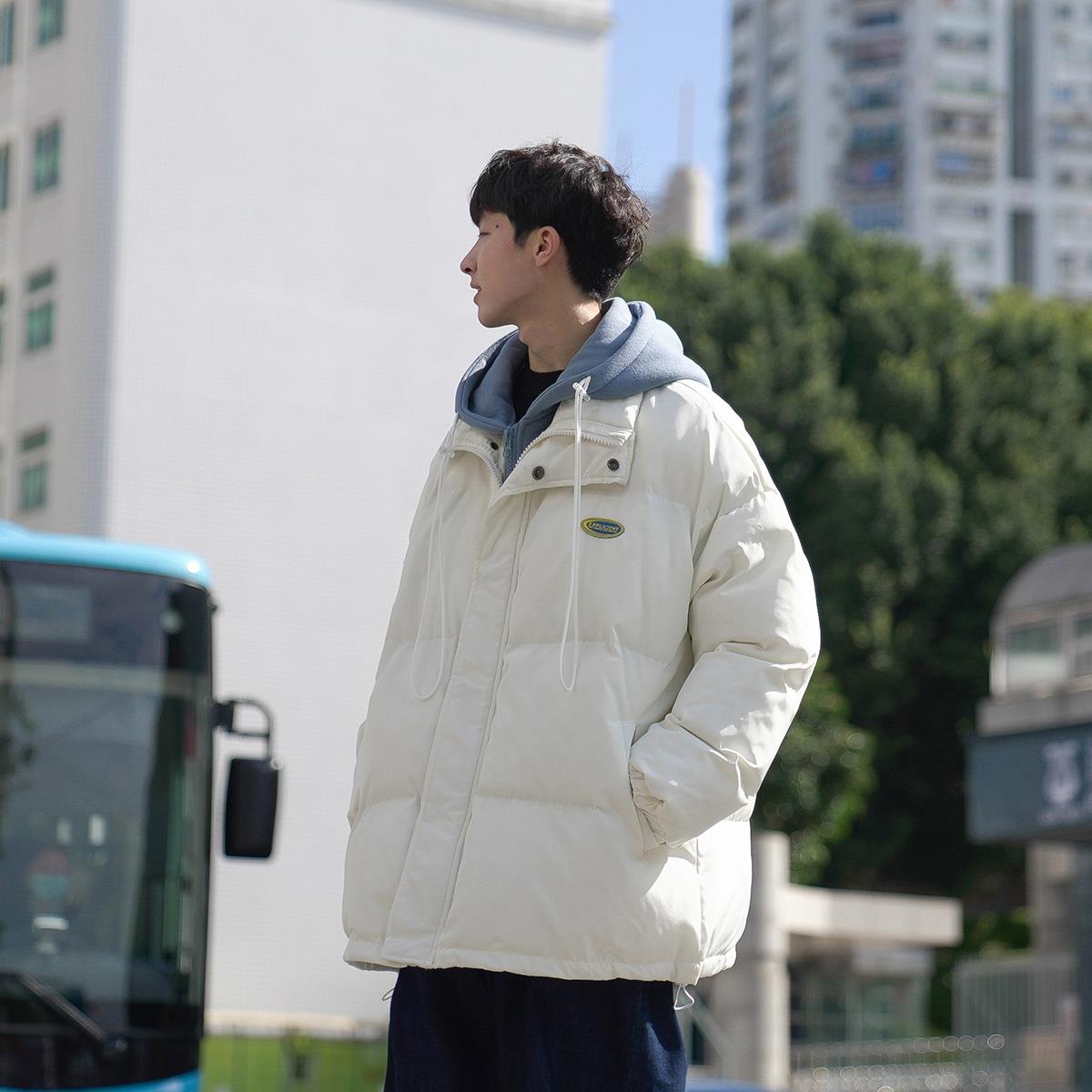 A020冬款男女同款棉衣假两件羽绒棉外套韩版宽松贴标加厚学生棉服