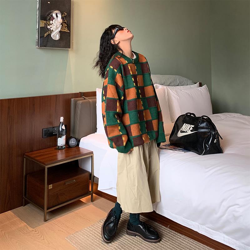 服饰箱包、运动户外 > 上装 > 毛衣女秋冬外穿韩版宽松2020新圆领套头复古撞色针织衫