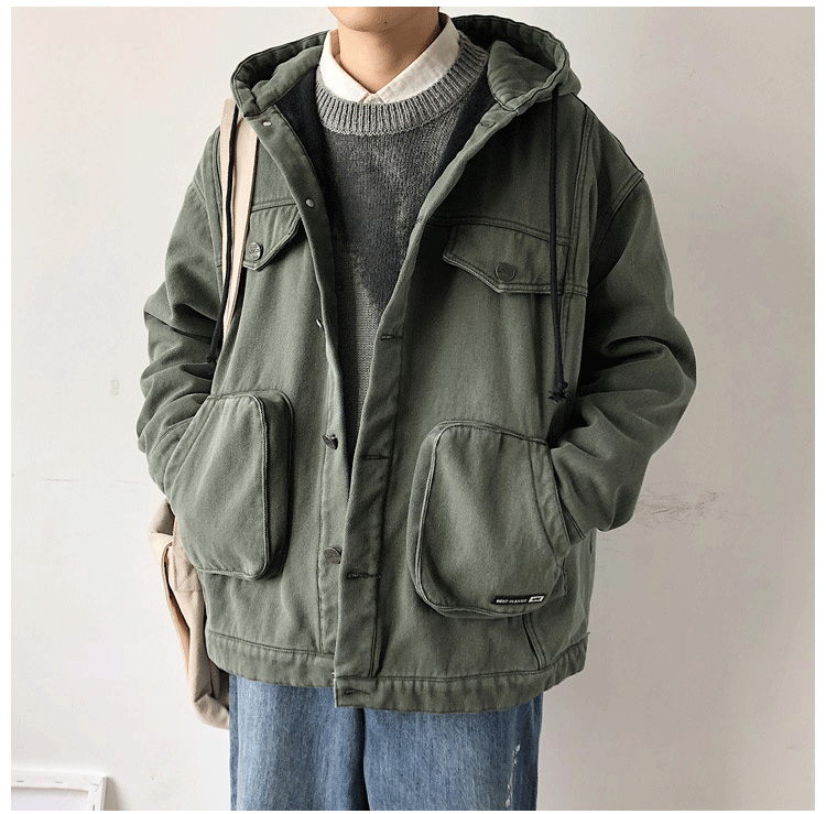 日系潮牌牛仔宽松加厚夹克男加绒秋冬连帽工装外套休闲多口袋上衣