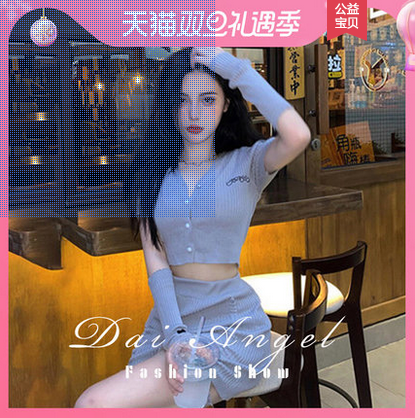 服饰箱包、运动户外 > 上装 > 气质灰蓝色针织套装女v领金贵名流露脐开衫辣妹褶皱显瘦包臀裙夏