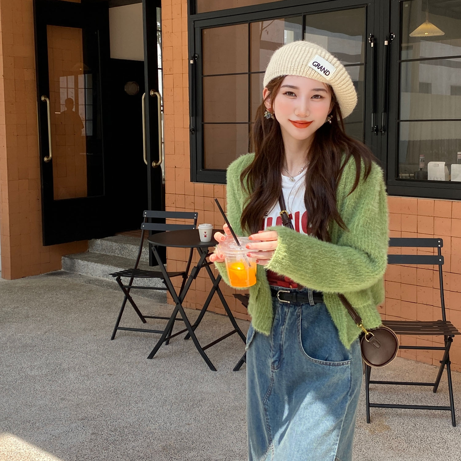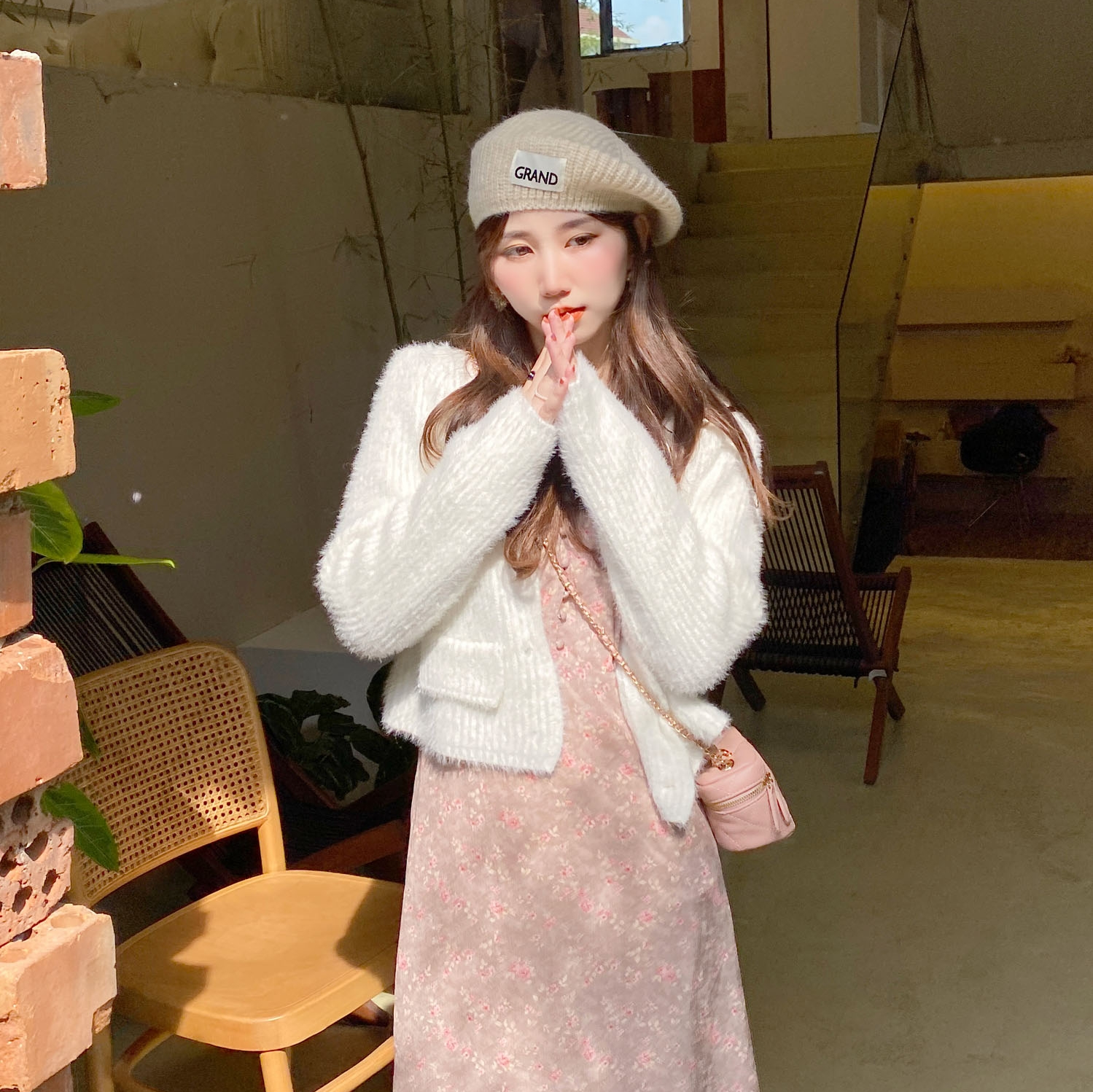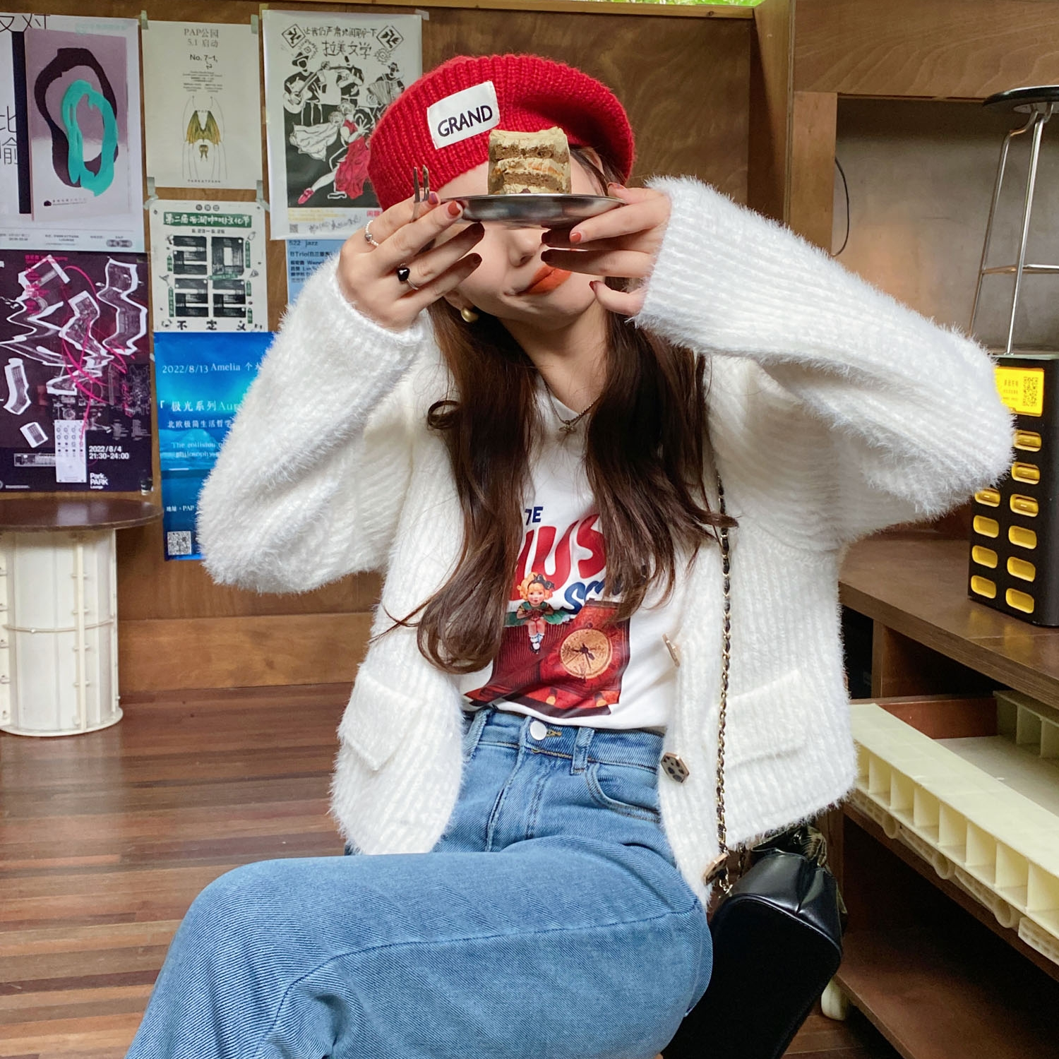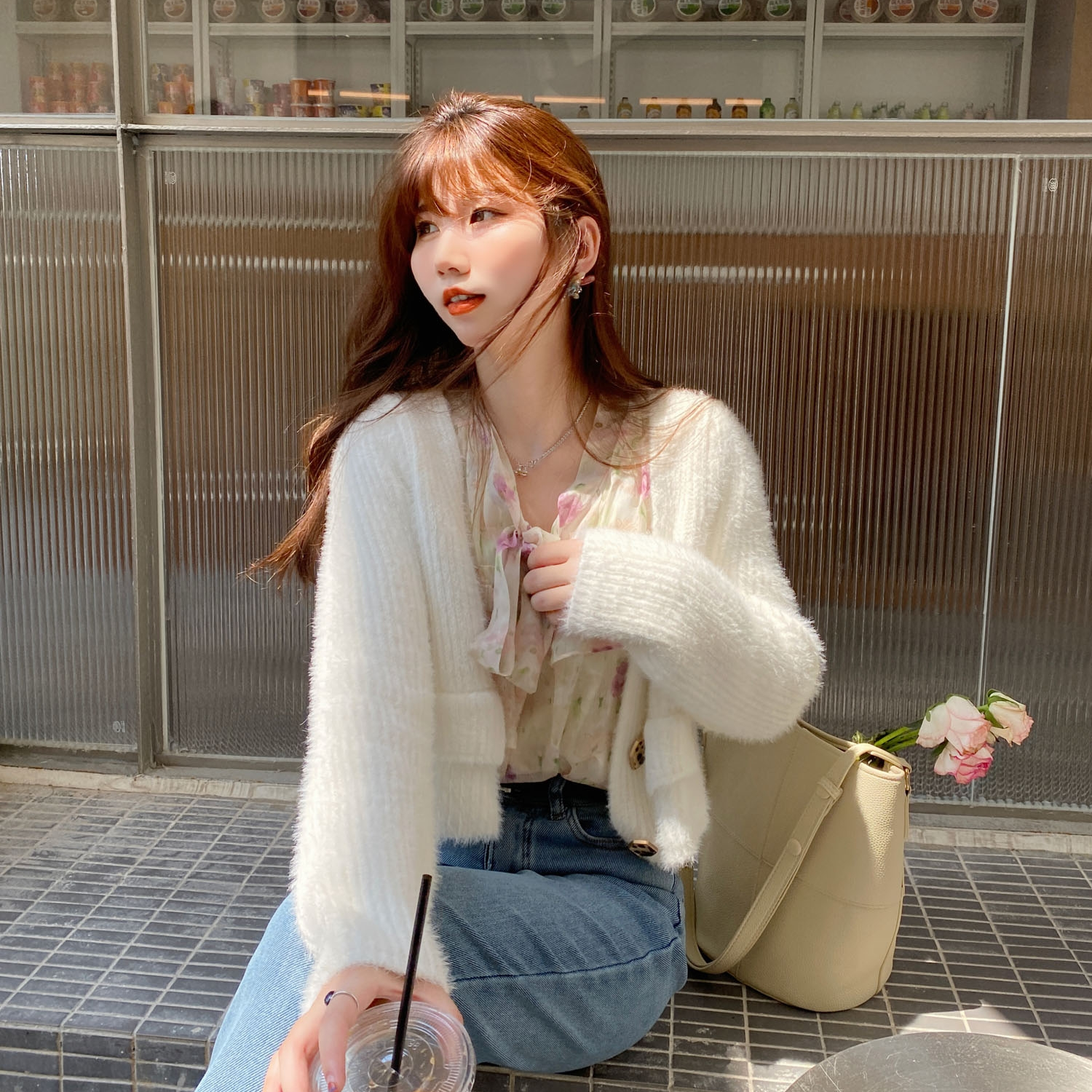 千衣千寻2022时尚舒适毛绒绒短款毛衣开衫韩系V领长袖上衣女秋,这个版型很舒适自带温柔感,宽松舒适的廓形很韩很温柔上身显瘦气质, V 领设计能够很好的 修饰脖颈线条,整身有蓬松感轻量感厚实但不厚重穿着无负担,门襟的豹纹不规则纽扣是点睛之笔好看又特别,短款衣长也适合小个子姐妹,平时搭配单穿或者作为内搭都很可。