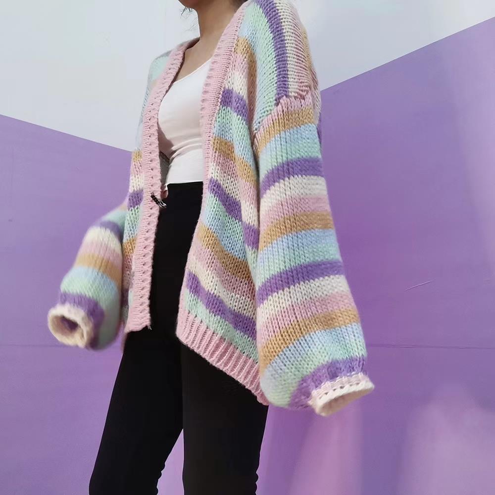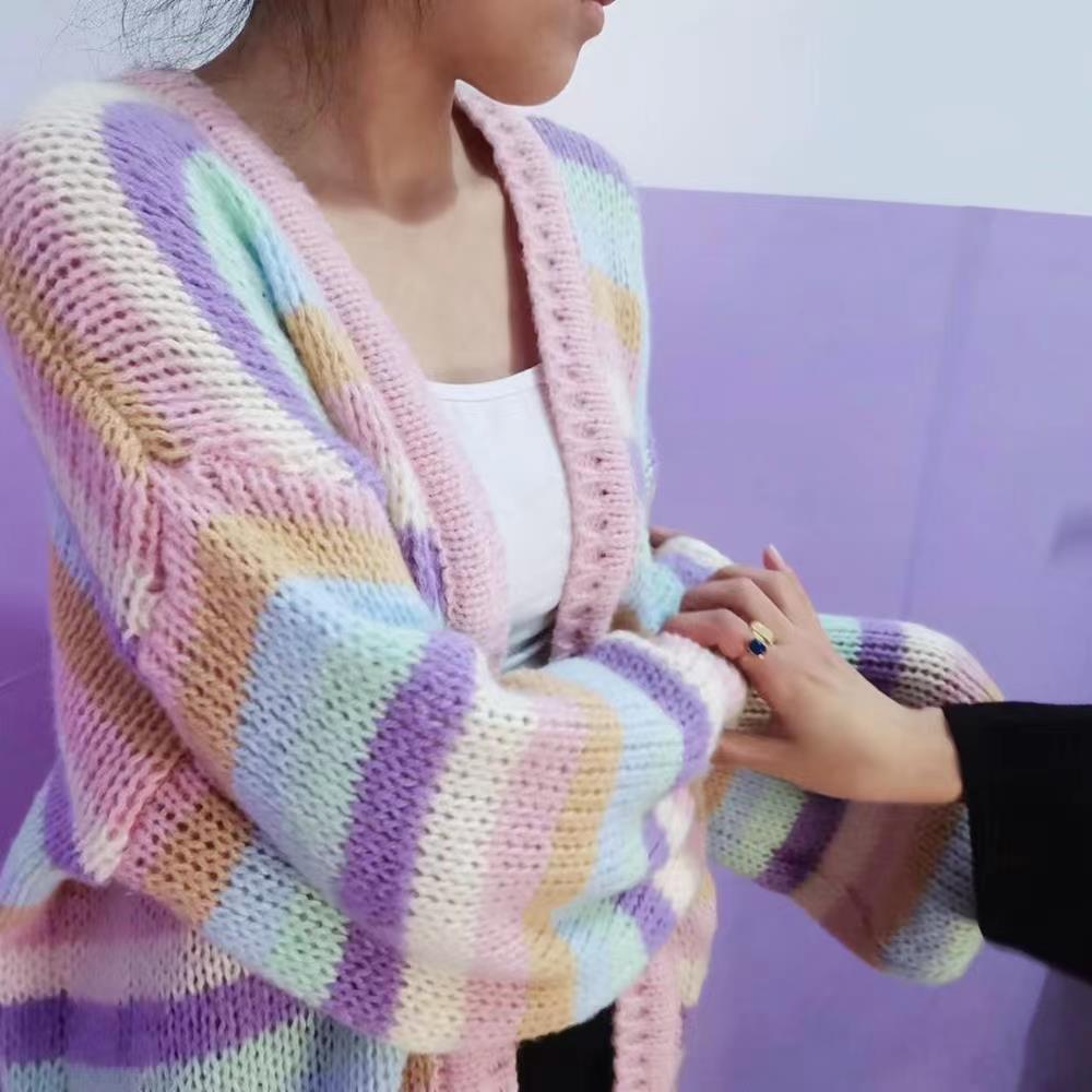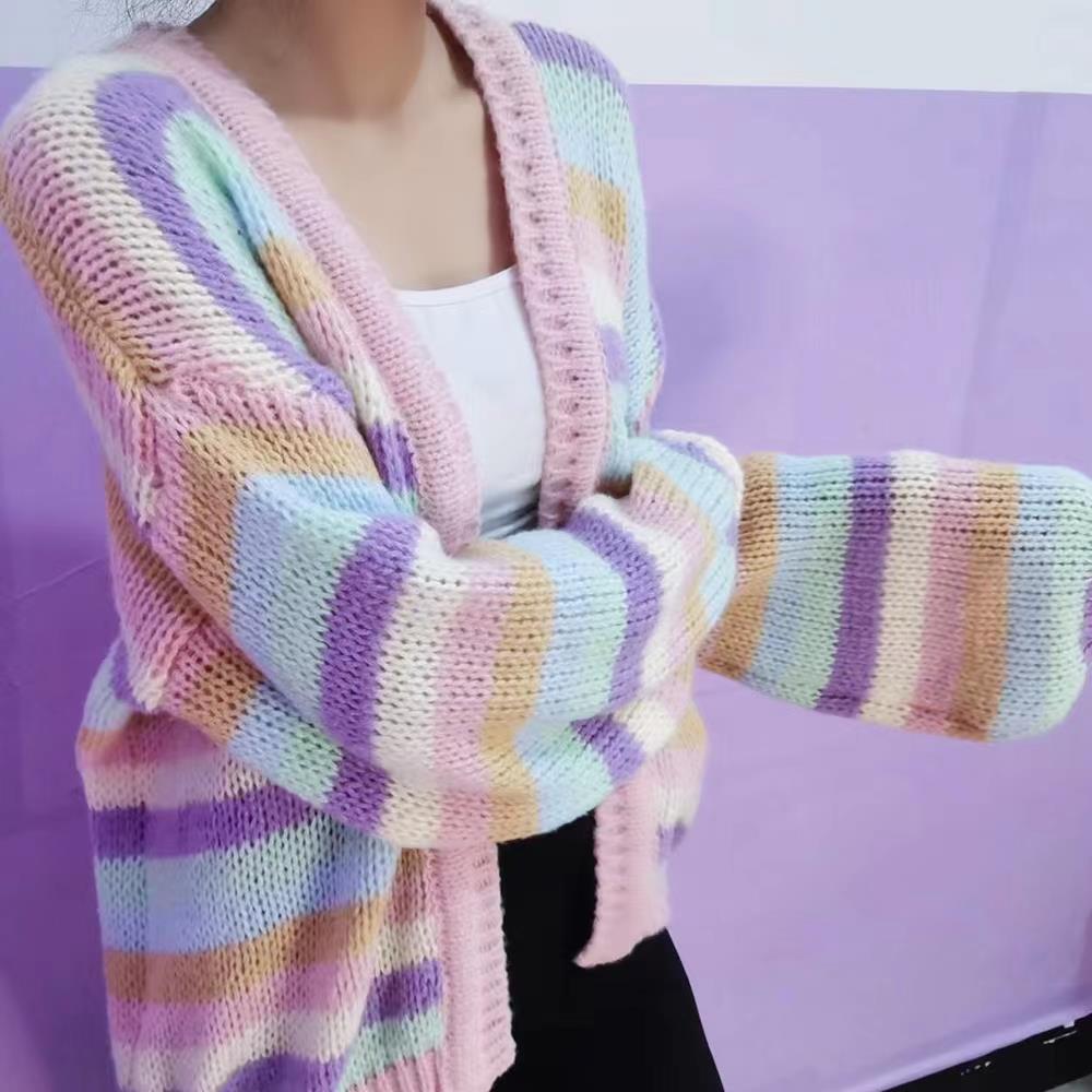 这款条纹毛衣开衫,复古又显青春活力,色泽柔和自然:手感蓬松柔软的毛衣,打造出慵懒惬意氛围感,开衫版型包容度 OK ,灵动俏皮的撞色条纹,散发着艺术美感,