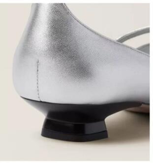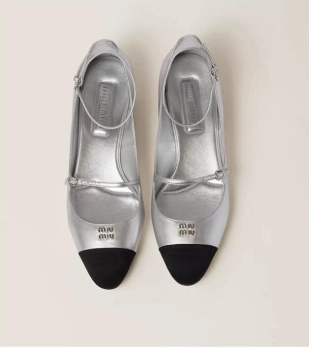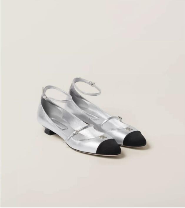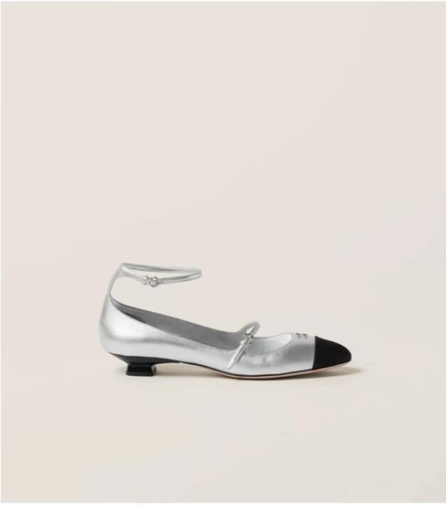 浪漫魅力弥漫于此款经典芭蕾平底鞋。仿水晶嵌饰对撞漆皮趾帽,闪耀熠熠光泽。标志性的Miu Miu仿珍珠点缀饰带,与金属带链条相搭,引人联想珠宝世界。