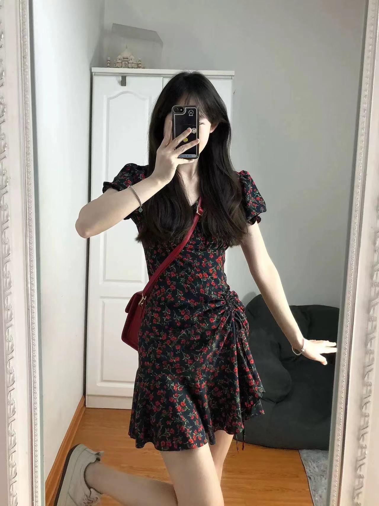 这次很好驾驭的连衣裙!这个花色的碎花还是蛮少见的显白显瘦还有气质一眼相中!短袖版很显瘦!!!v领+微微的泡泡袖腰部下摆做了抽褶设计搭配个棒球帽就很阳光活力美少女很日常的look