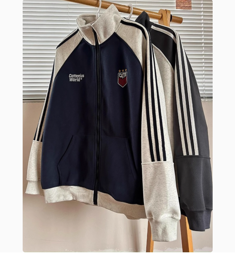 美式复古三条杠外套男春秋插肩袖开衫卫衣潮流撞色运动休闲棒球服