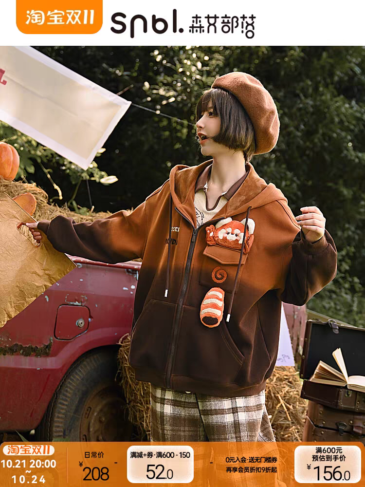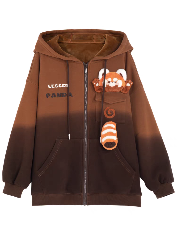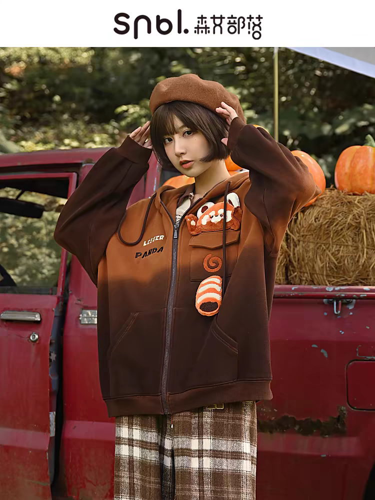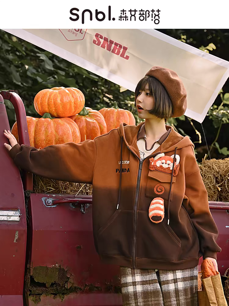 VIFASHION全球店森女部落原创美拉德风渐变棕色休闲帽衫小熊猫加绒卫衣外套萌趣冬