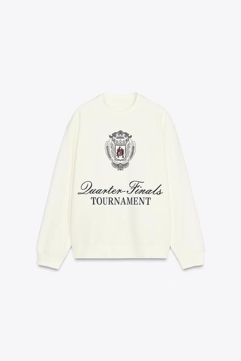 棉纺卫衣,圆领长袖,正面文字和盾标刺绣装饰,罗纹饰层
