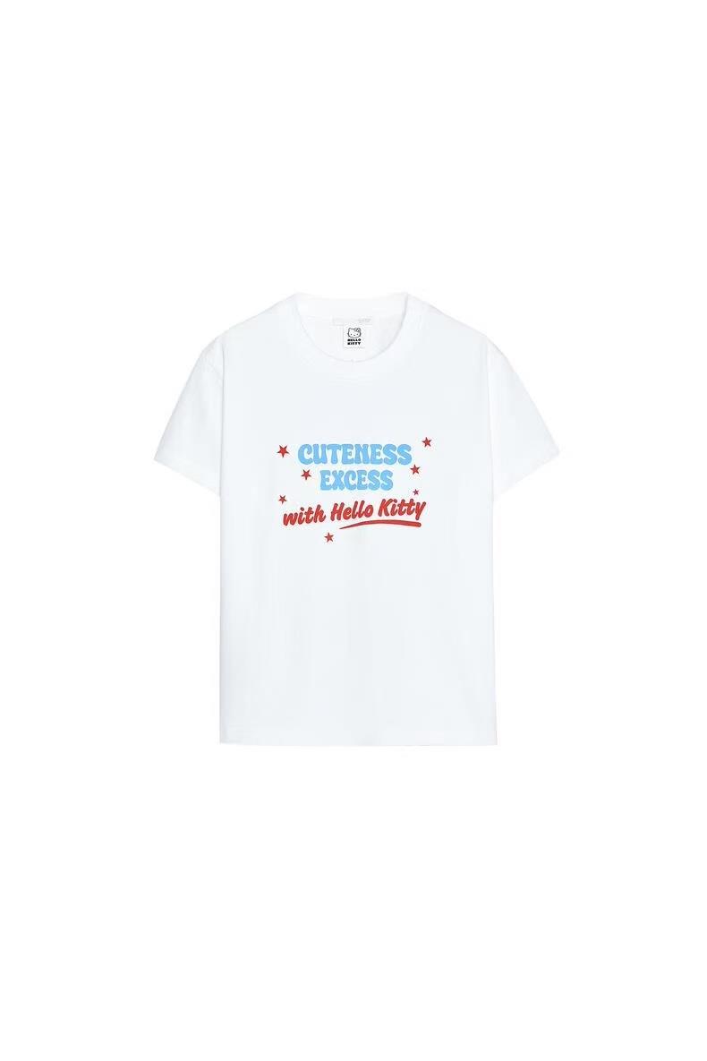 圆领短袖 T 恤。领口磨损细节装饰。©2025 SANRIO CO., LTD. 凯蒂猫印字及印花装饰。