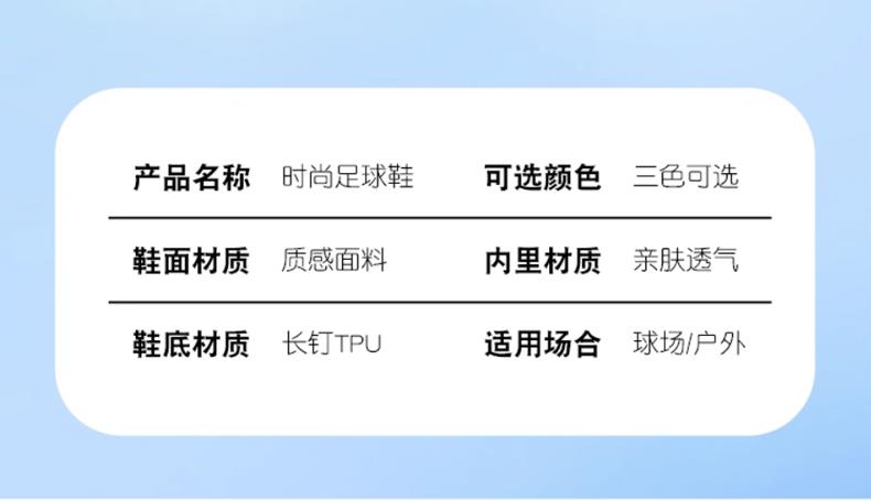 性别: 通用帮面材质: PU运动鞋外底: 其他是否瑕疵: 否鞋帮高度: 低帮鞋钉种类: FG(胶质长钉)适用场地: 土地/短草坪功能: 抗冲击运动鞋科技: 其他是否库存:是