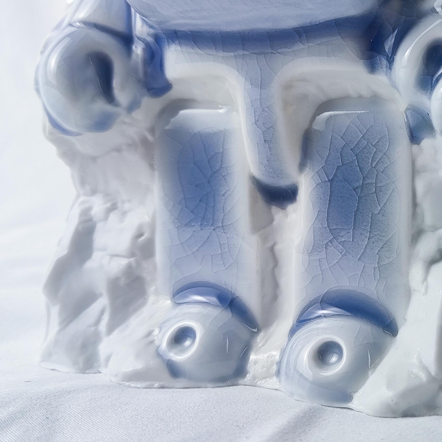 脚印;熊则代表了当代的潮流单品。这个时代是快速发展的,现在看上去热度很高的潮流快消品,最终都会成为构建潮流城堡的块砖。作品采用雕刻技法将两种元素结合,表面采用吹釉法,将陶瓷独有的开片纹肌理效果展现,希望作品都能以国风的形式展现。