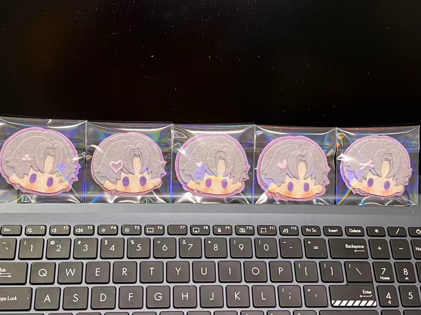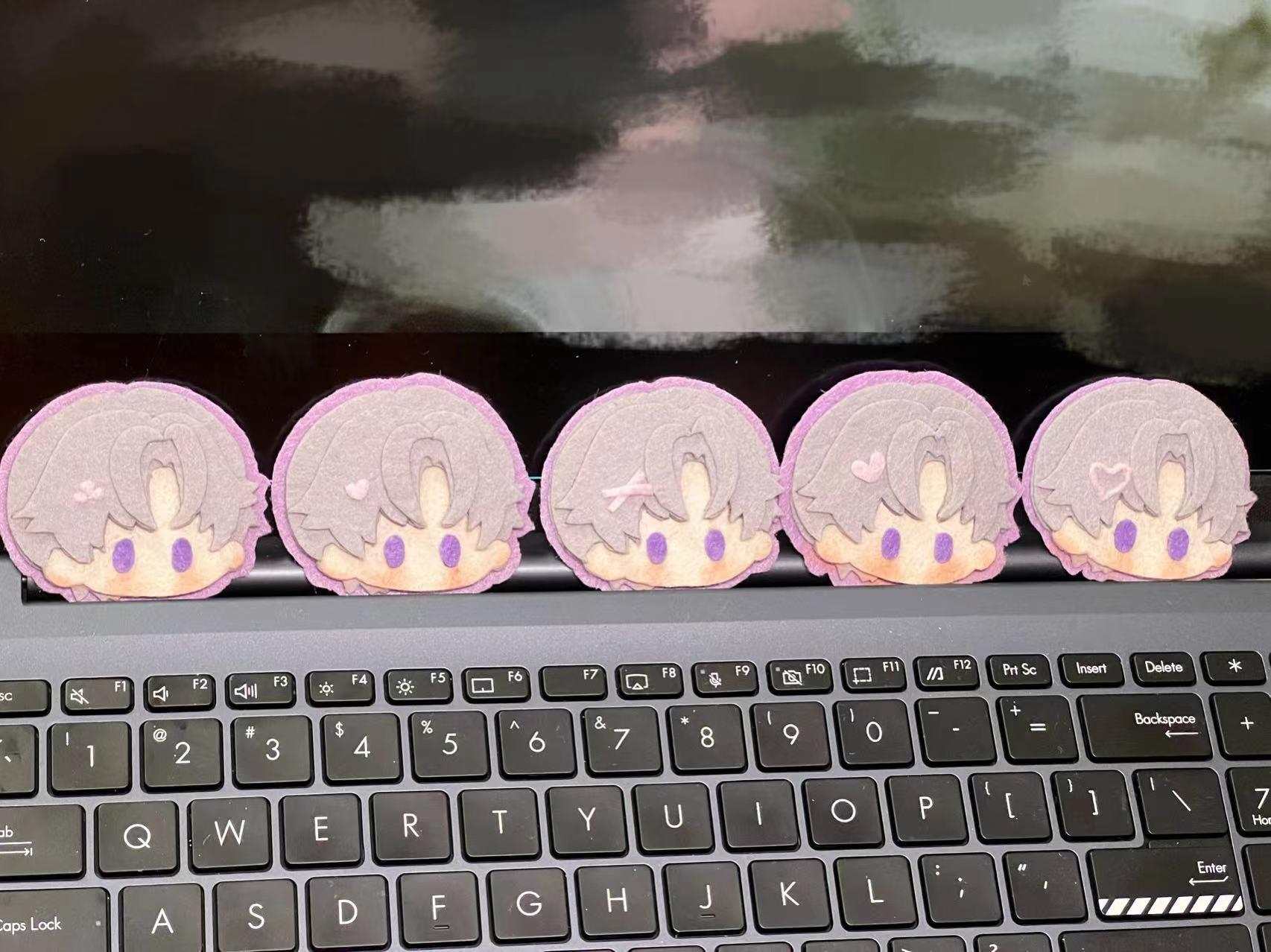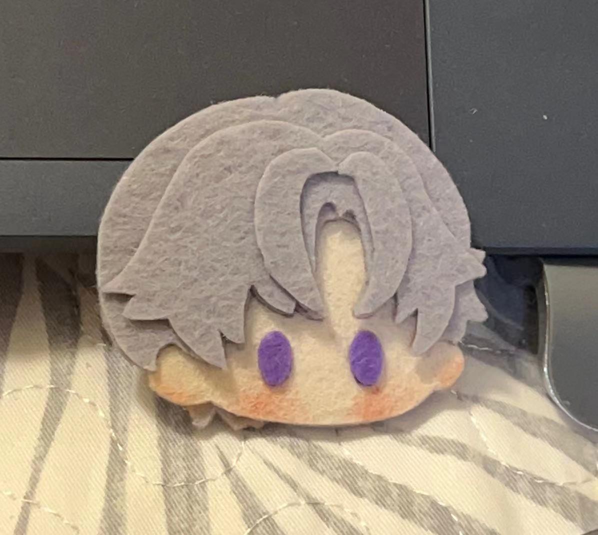 共由九个部分组成的成品,一个浅紫色的底色块,五个灰色发片块,一个肤色脸块,两个深紫眼睛块。