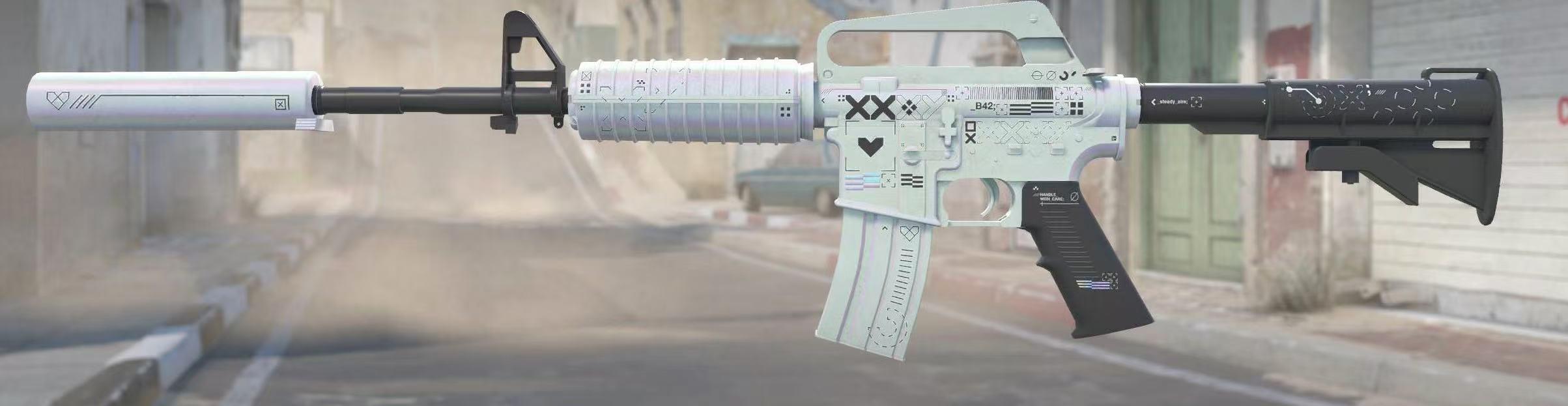 M4A1印花集皮肤的主要特点是其大片纯白的枪身上布满了各种未来感的文字和会变色的镭射条。这些设计元素在每款皮肤上都有所体现,但由于枪身较长,黑色部分的处理也有所不同。此外,枪头位置有爱心、实心及空心的X标志,这些设计元素不仅增加了皮肤的视觉效果,还具有一定的象征意义