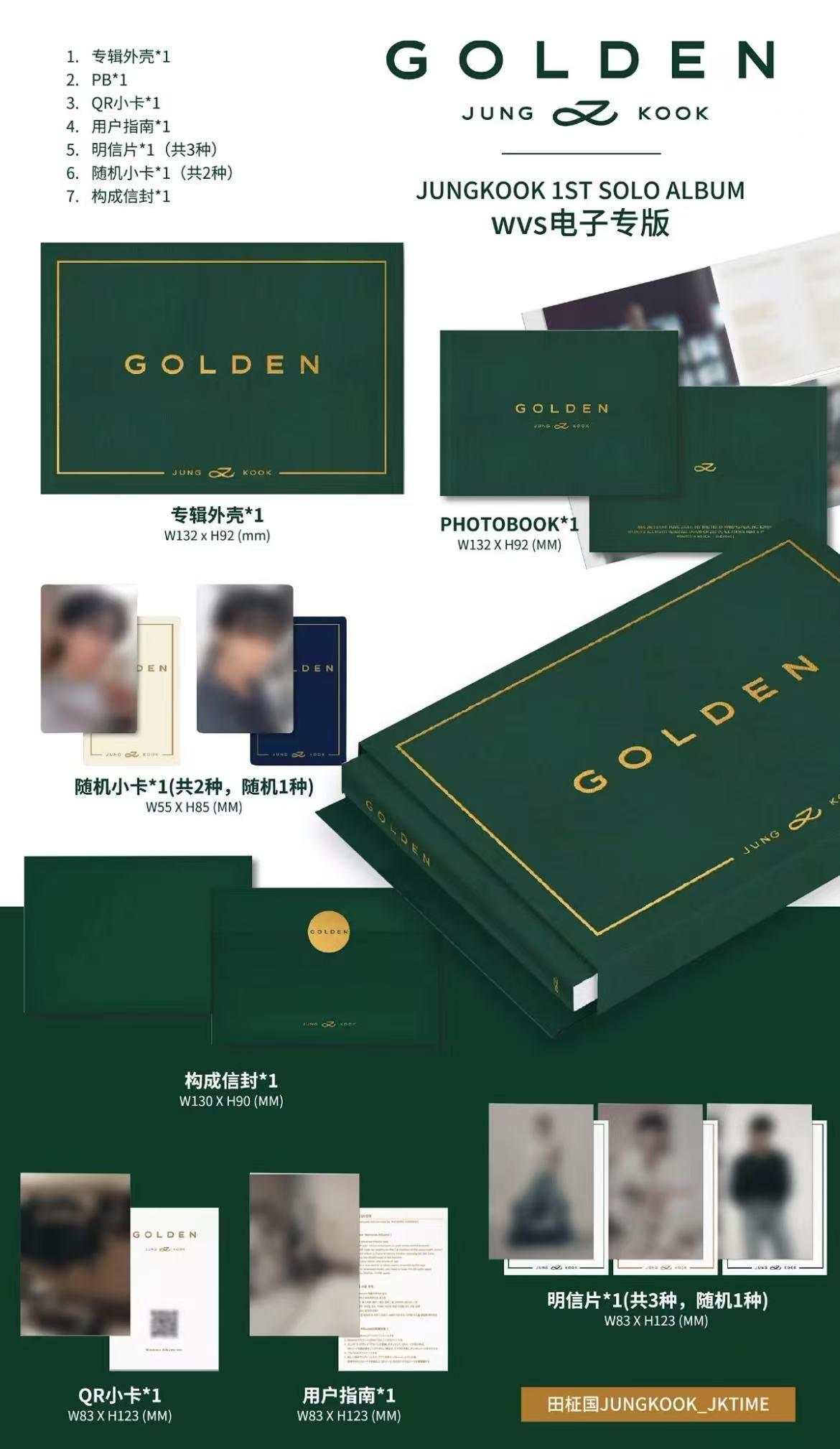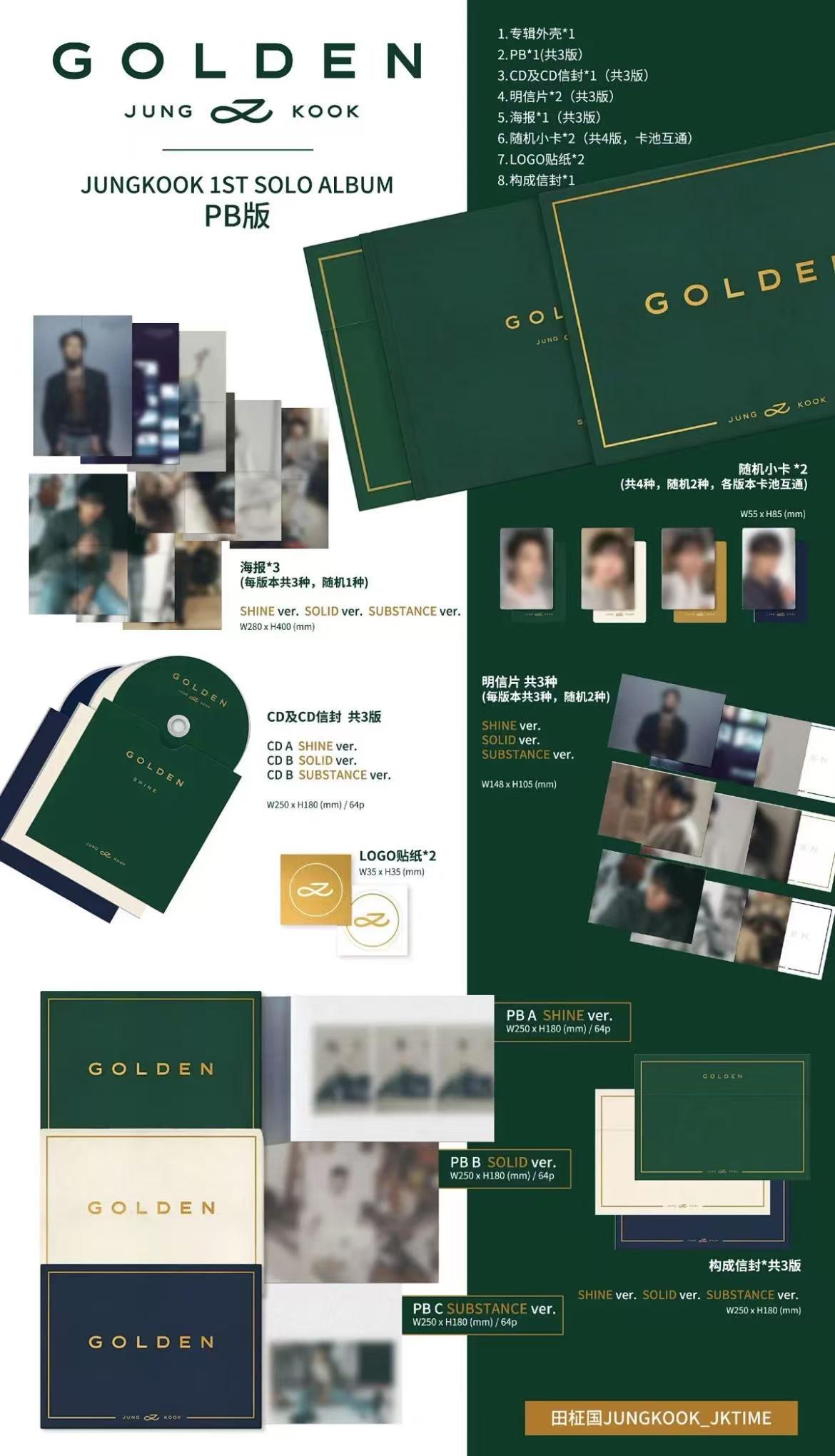 专辑外壳*1,PB*(各三版),CD及CD信封,明信片*2,海报*1,随机小卡*2,LOGO贴纸GOLDEN是田柾国首张录音室专辑 ,于2023年11月3日正式发行,记录了他从防弹少年团“老幺”成长为世界级歌手的历程 ,对粉丝而言意义非凡。