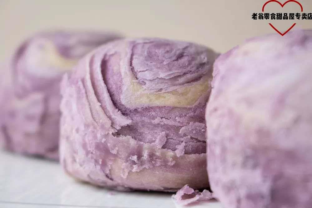 紫薯芋泥球像是裹了淡紫色的花瓣,层层叠叠,酥皮稍微有点松,吃的时候小心掉渣。
