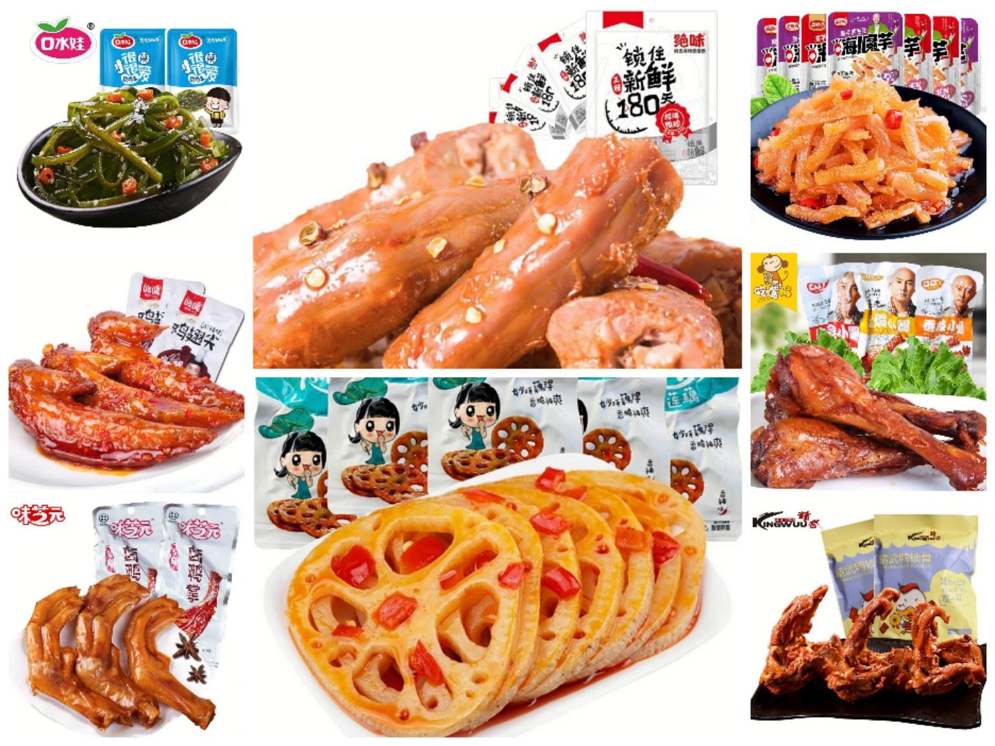 产品包括:绝味鸭脖+味芝元鸭掌+香辣鸭腿+香辣鸡腿+ 香辣鸡翅尖+小馋嘴莲藕+魔芋素毛肚+ 海带